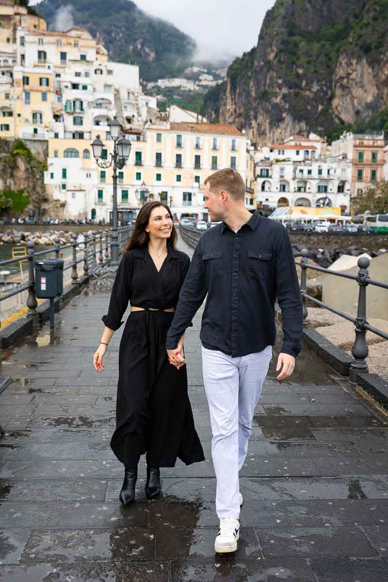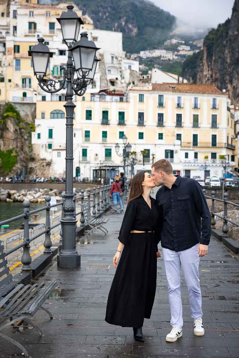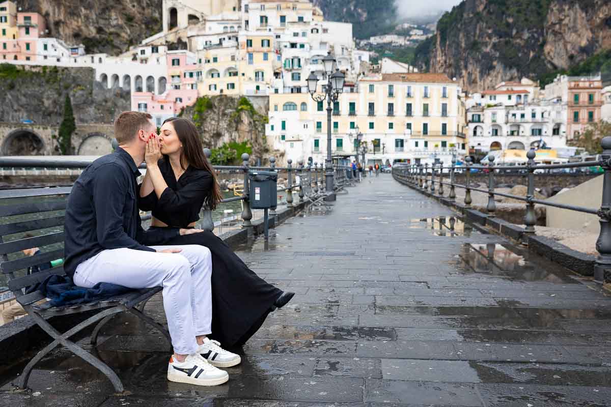 What a beautiful proposal from the Costiera Amalfitana in Italy! Waiting for the perfect moment to arrive. And just as the rain started to subside. We stepped into the Amalfi pier to ask that one special question! Framed by the town and the Mediterranean sea in the background. A touching moment followed by a faithful yes!