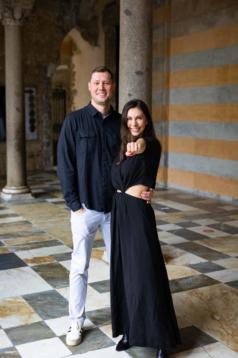 Starting from the pier where we took some nice portrait shots while walking and sitting on a bench. Then we ventured into town and couldn’t resist from taking engagement ring photos over yellow lemons which we found along the way! With a quick stop in Piazza Dante to take pictures by the water fountain. And then continuing on with more engagement photos taken at the bottom of the Duomo staircase by our local and talented photographer. As well as all the way up at top to take some final portrait shots underneath the church portico. Among embellished columns and window views over the town and the skyline!