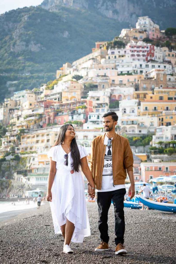 Couple photoshoot in Positano from an exclusive villa hotel including pictures on the beach with the vertical town in the background