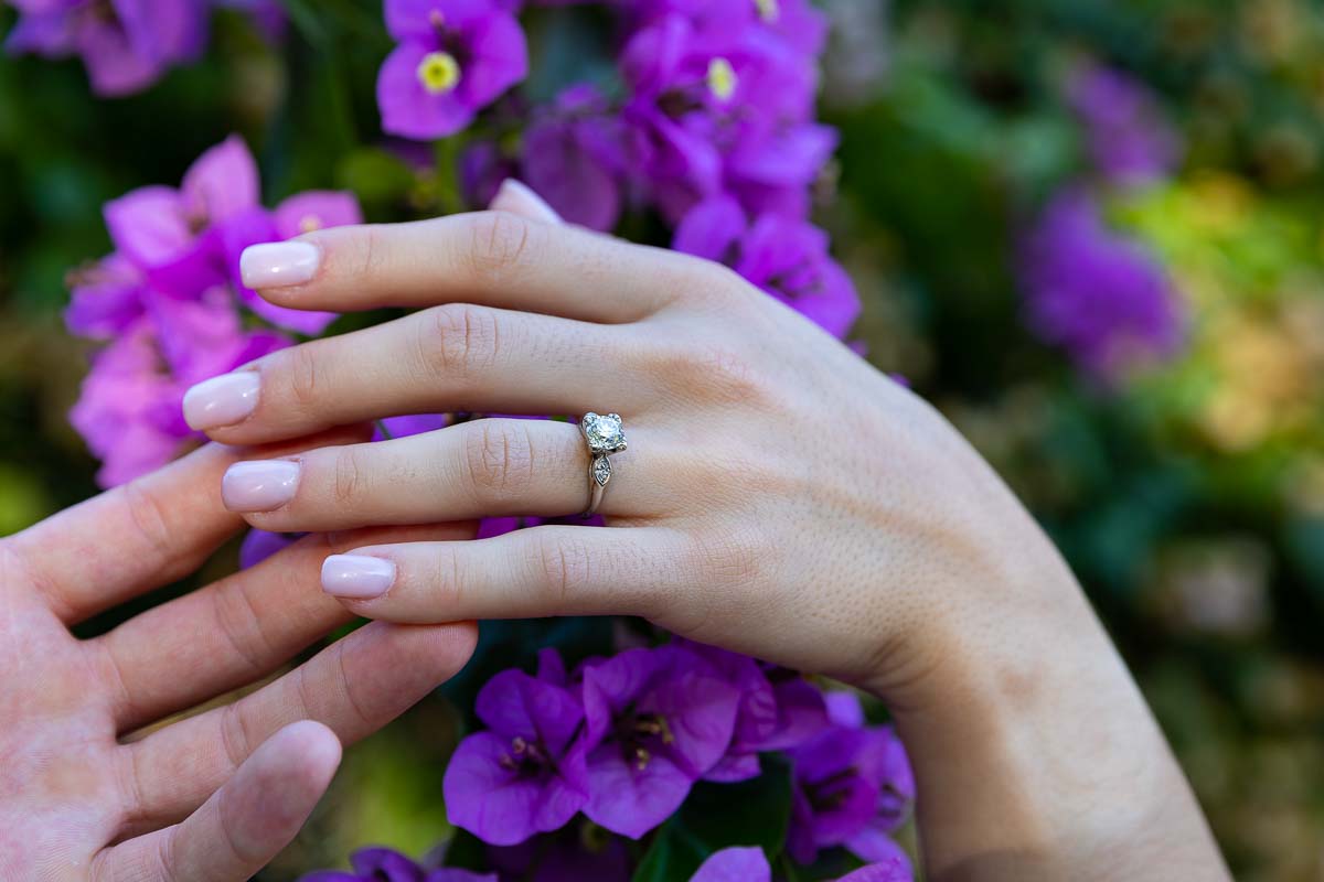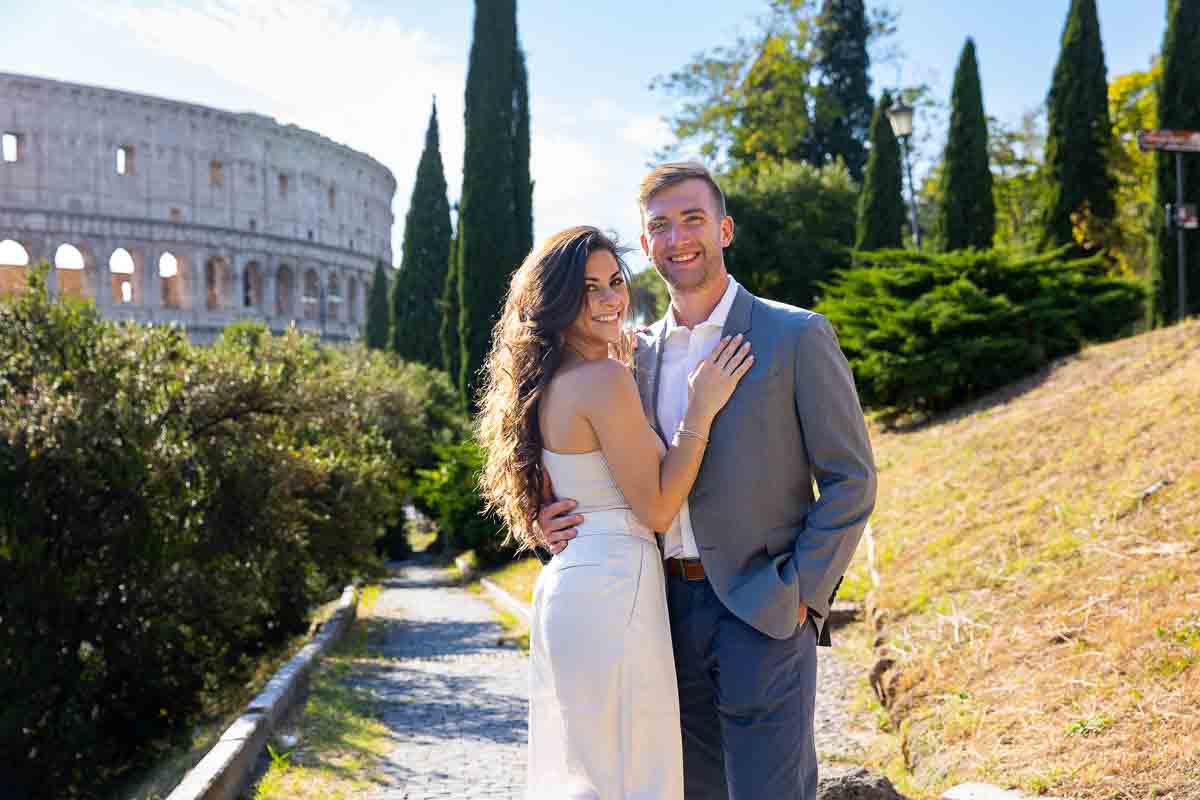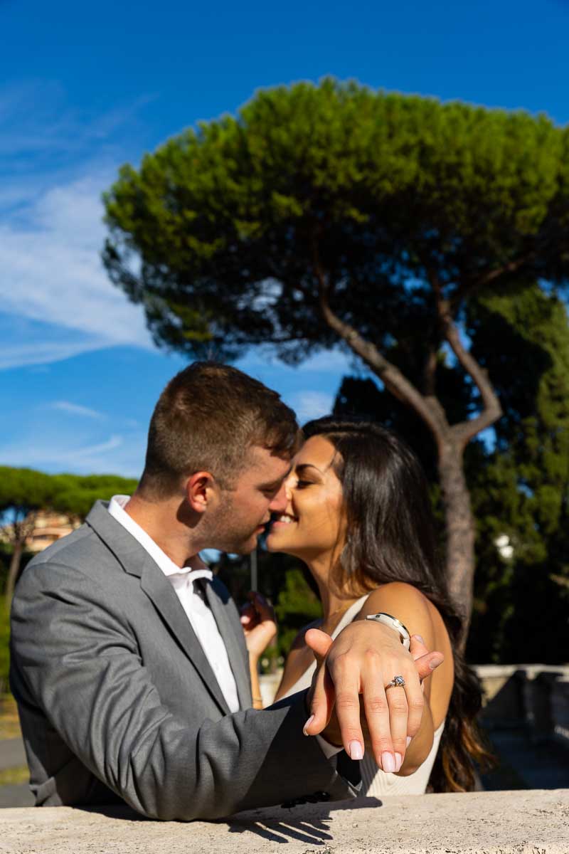 Starting first with some nice posed portraits in this wonderful location. With different angle and background views. Then changing spot to include a typical view which you may find in Rome. The Mediterranean pine trees. Which made for a great background shot! Then we took a small walk over to the other side of the Colosseum. Where we photographed the beautiful engagement ring over bright fuchsia flowers. Ending the photoshoot at a different park view over the Colosseum.
