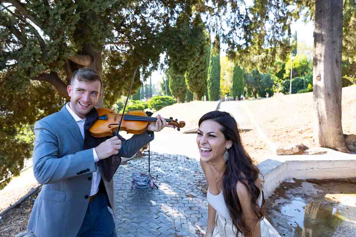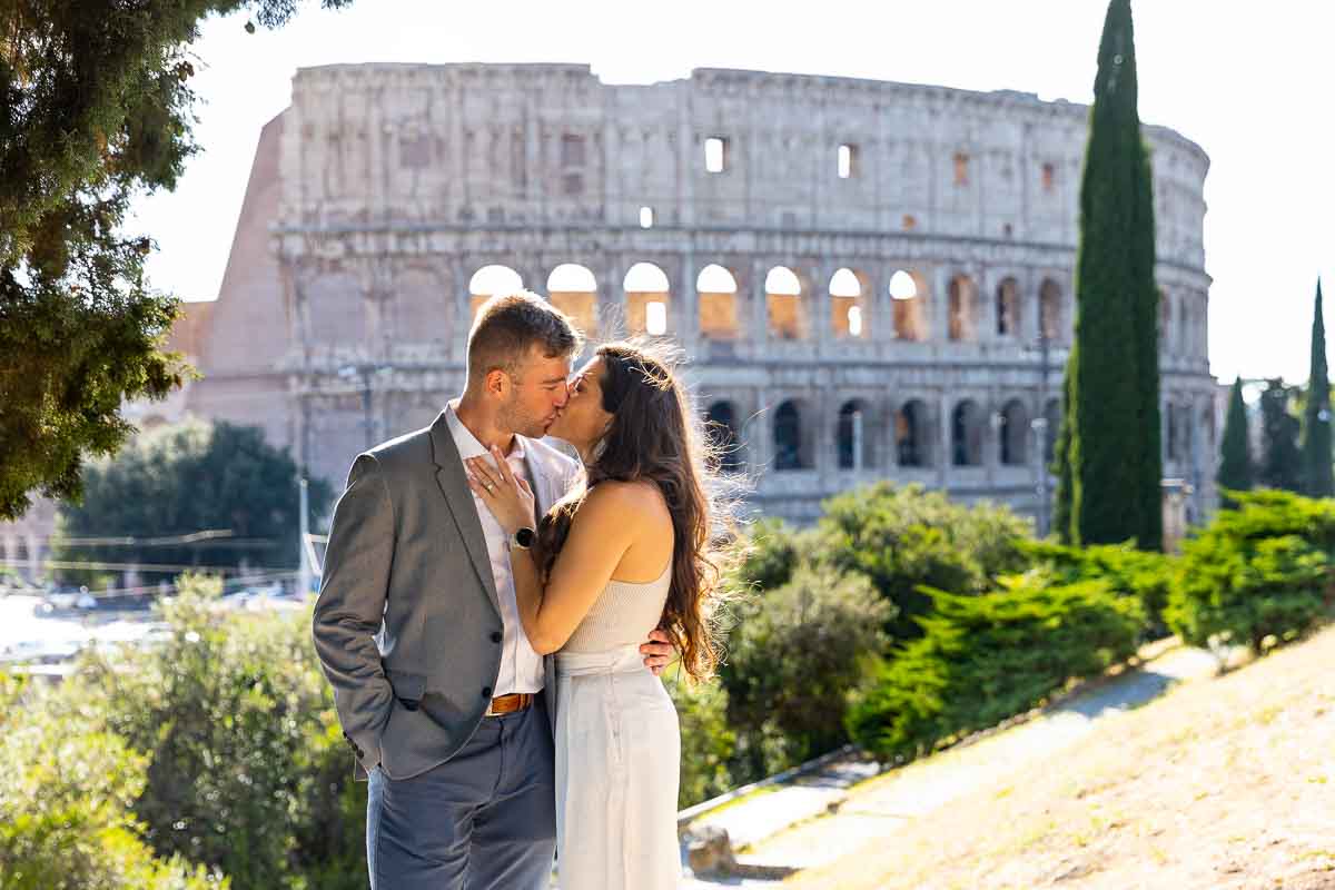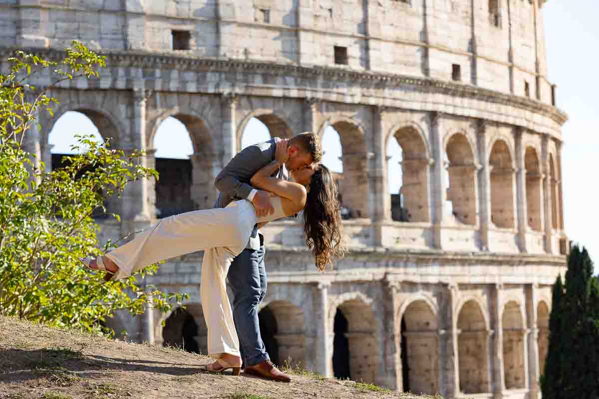 A nicely executed Wedding Proposal taking place at the Roman Colosseum. Perfectly set up in a truly remarkable spot with a unique view over the Colosseum. During a Couple Photo Shoot which turned into a very special moment. Next to a violinist which apparently was playing along like a street musician. And when the knee down moment arrived. The violinist started playing their very special song! A surprise which was welcomed with overwhelming joy! Which brought us to take some really nice engagement photos in the environs.