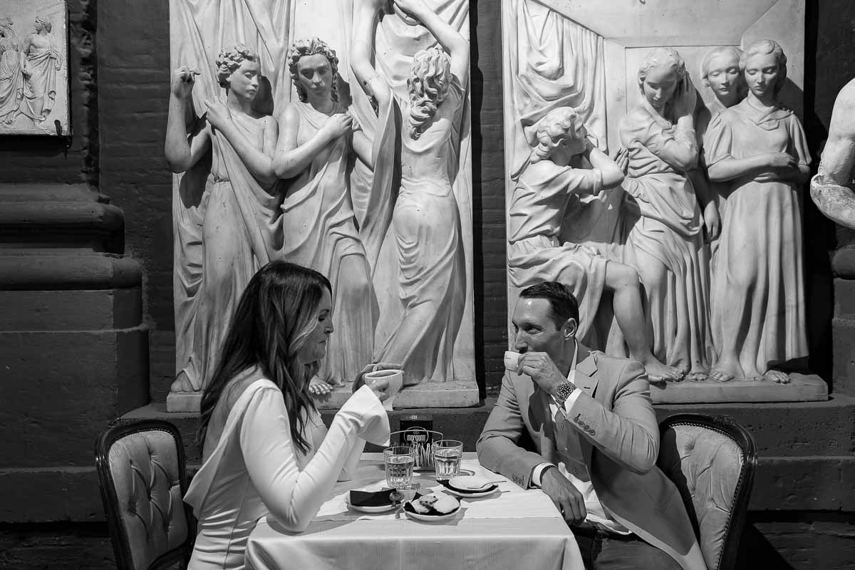 At this point the city started to wake up and the morning traffic was on the rise. So we ended the couple photo shoot in a very atypical bar. Made inside what it seemed to be a sculptor’s laboratory!