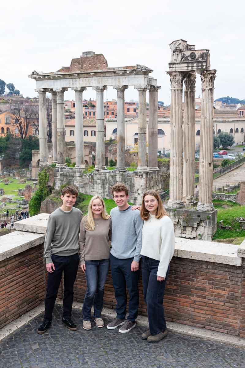 Family portrait pictures taken at the Roman Forum posing down in front of the ancient temples and monuments