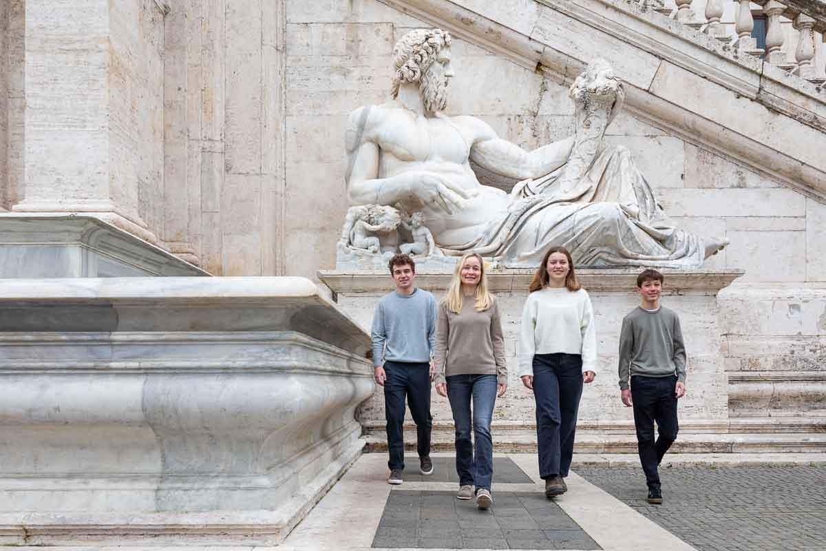 Later we took some more candid shots walking around the environs. Before ascending the stairs to get back to the main square. Where we found this amazing ancient roman marble statue which we used as background to some more photography. Ending the photo shoot on the other side of the square. By the Caffarelli terrace which has truly incredible view of the ancient roman skyline. With many distant church domes. Concluding the shoot with some final pictures with the ancient buildings of the Piazza del Campidoglio in the background! Check out this similar shoot here at the Roman Forum.