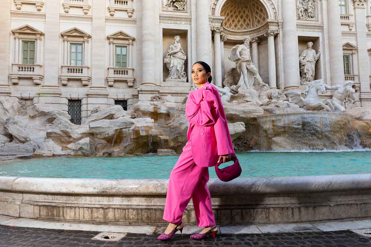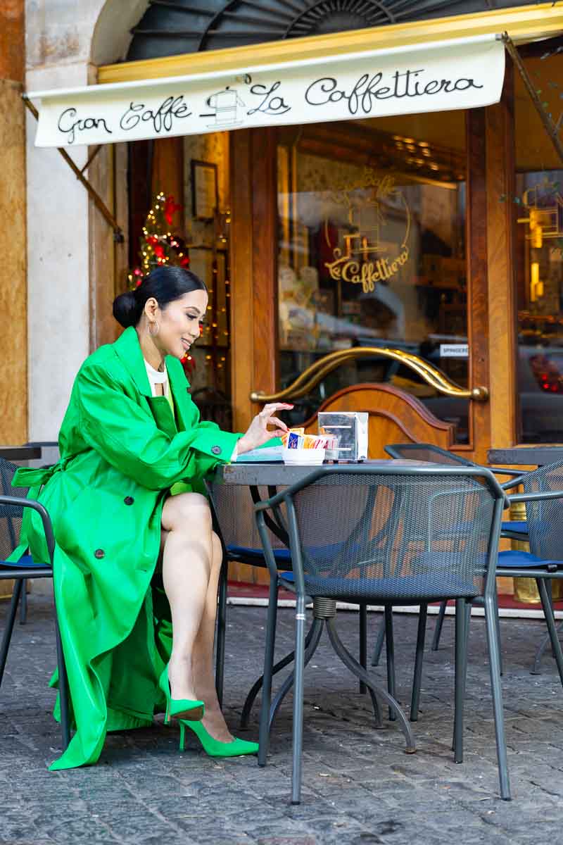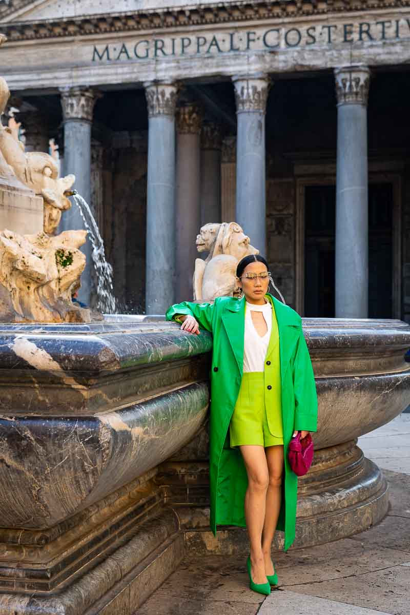 We started at the Trevi fountain with some really nice solo shots in bright pink as out first outfit! Which reacted well to the light of the flash with the white marble of the Trevi fountain in the background. Then it was a matter of finding just the right pose to set the right style. After this initial set. We also included some nice family pictures. In front of the fountain and with church Santi Vincenzo e Anastasio a Fontana di Trevi. Then we wrapped up and moved on to find some nice caffè to take some everyday pictures. Using a hired minivan with driver as transport but also as changing room! Optimizing the time needed to reach the new location with an outfit change. So we arrived at the cafés in bright green! This was our second outfit change. Which we tried placing in the context of a typical Italian settings such as the small bars and caffè found around the city of Rome.