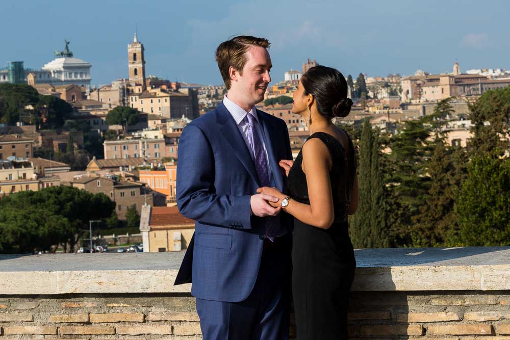 A truly spectacular wedding proposal candidly photographed from the side lines. Overlooking the beautiful city of Rome in the distance. So much joy and happiness in such a unique location. With the clapping approval from the people surrounding us! We began the engagement photography right there on the terrace. The light was just nice as we were approaching sunset. We looked around the park for the perfect settings and the best light. In between photos, we briefly pulled to the sides to photograph the beautiful engagement ring. And then continued on gathering different images and ideas. We stopped underneath the entrance arc for a nice portrait. And at the water fountain just outside the park. We then moved over to shoot under the arches of Church Santa Sabina and then stepping inside to have a look.