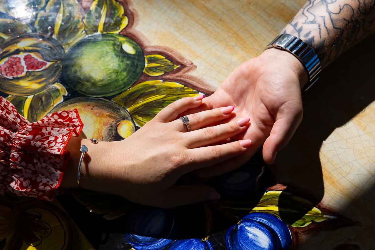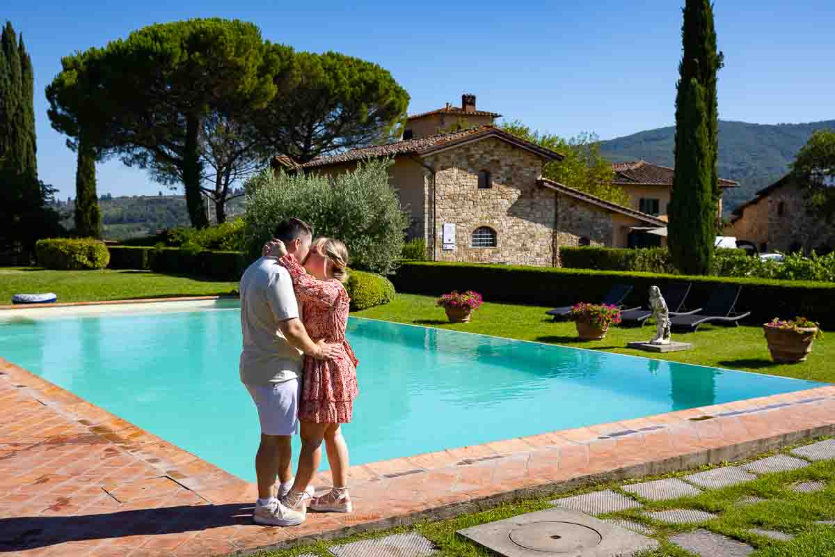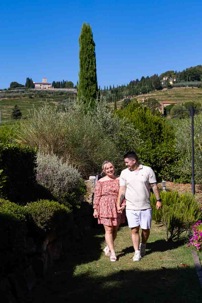 Then after catching breath from the great surprise! We made acquaintance and began the engagement photo shoot. Taking pictures in surrounding area. Finding nice little spots to take some nice photos. Starting from the vineyard where we took some walking shots. Visiting the gardens and the swimming pool where we took some posed portraits. Which are immersed in the tuscan countryside context. With typical cypress trees and nice rolling hills and small towns on the background. Then we circled back to take some final portrait pictures after having proposed in Tuscany! Including some really nice shots of the engagement ring!
