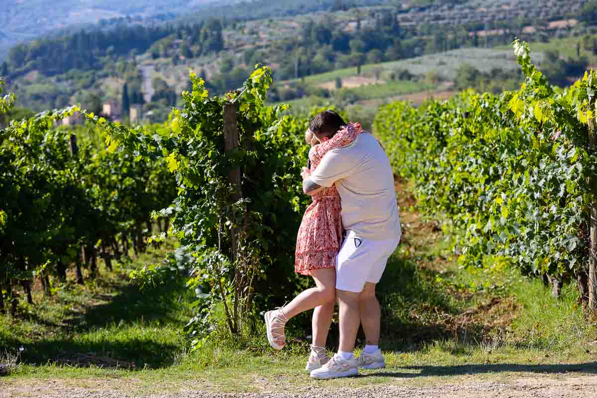 Popping the Big Question on a beautiful day and on a scenic Tuscany countryside winery near the Greve in Chianti region. Set up to take place at the head of the vineyard rows. Just before the start of a wine tasting experience. With a typical Tuscany scenery in the background. Where the Proposal photographer in Tuscany arrived just a little earlier to scout out the area. Meeting with the couple almost by chance. And exchanging a silent signal to make sure that we were on the same track. Without giving away the surprise effect! Then it was just a matter of finding the right moment and the right words! Where the faithful question was welcomed with a great deal of joy and happiness!