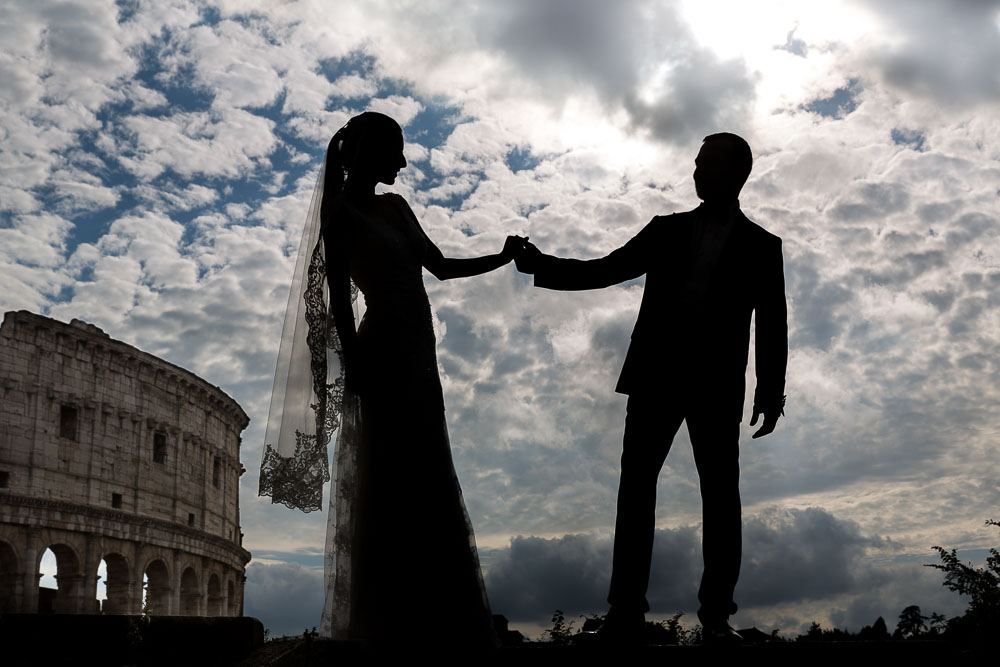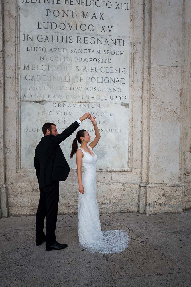 It’s easy to capture some great photography when you have such a photogenic couple together romantically in love in Rome. We had a clear idea of the places that we wanted to photograph and photograph and began the wedding photography session at the Roman Colosseum. Where some spectacular light was waiting for us. We used a car service to move around locations and we headed first to Piazza del Campidoglio. Where we took snapshots by the roman forum ruins and on the magnificent staircase. Our next destination was Saint Peter’s square in the Vatican where we took some interesting pics under the columns, by the water fountains and in front of the Basilica. We concluded the photo session at the Spanish steps getting some nice architectural images as well as some lifestyle photos with some of the bystanders sitting down on the steps. Lastly we shot one last photo under a chic poster!