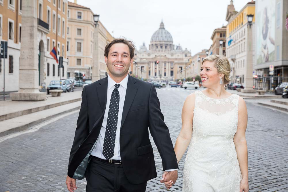 What an early photography session in wedding attire this was! But you can get a sky like this only around dawn. With such deep blue tones. So we began taking pictures on the Castel Sant’angelo bridge which was deserted. Another benefit in setting up the photo session so early in the morning. Shooting underneath our favorite angel statue. Capturing some closeup of the wedding rings with an interesting and significant background. Then making our way down below to the Tiber river bank. Shooting some interesting pics on either side of the bridge. And concluding this wonderful photo session on Via della Conciliazione for some nice newlywed portraits!
