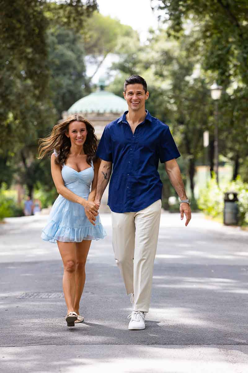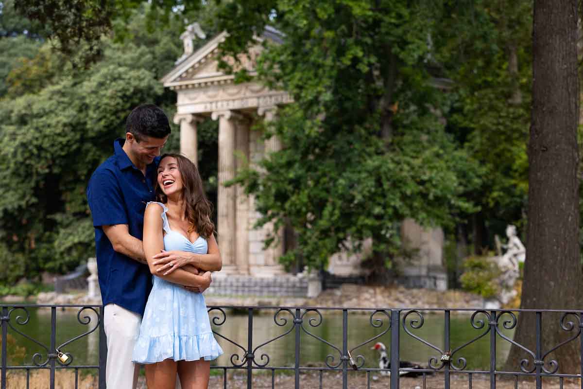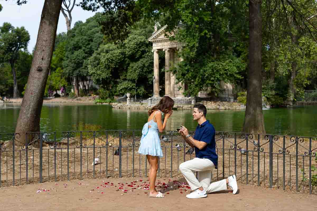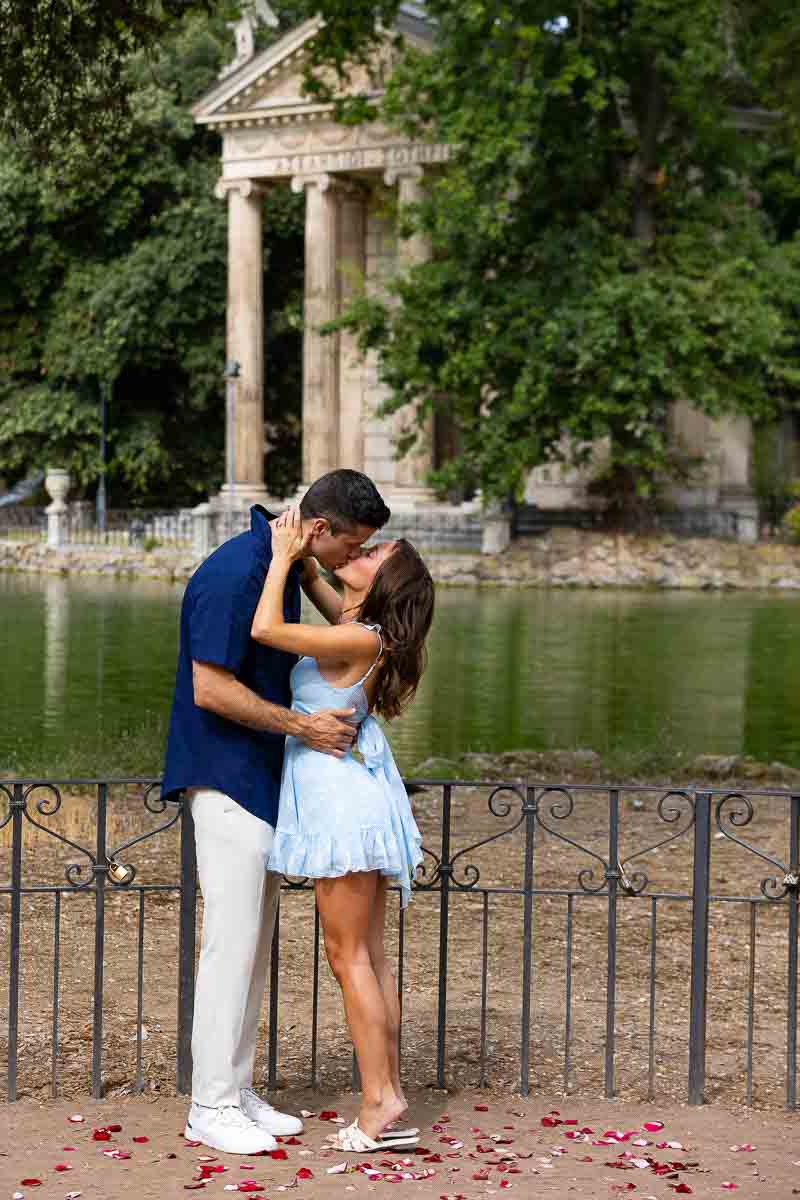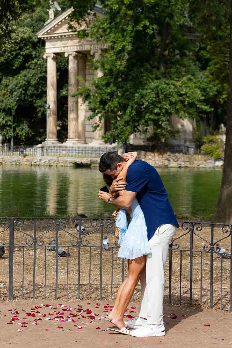 What a wonderful lakeside proposal in Rome this was! Marking the perfect spot with rose petals on the ground! And finding them as you casually stroll around the lake in the Villa Borghese park. A beautiful proposal candidly photographed from a distance. With the scenic view of Temple of Asclepius in the far background. A surprise which was welcomed with joy and excitement! Making acquaintance with the photographer and his wonderful assistant after recuperating breath from the great surprise! And later to begin a fantastic engagement photoshoot around the park.
