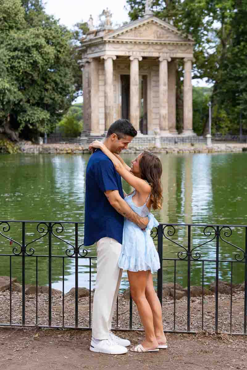 Surprise Engagement photography at the Villa Borghese lake with the scenic Temple of Asclepius as backdrop