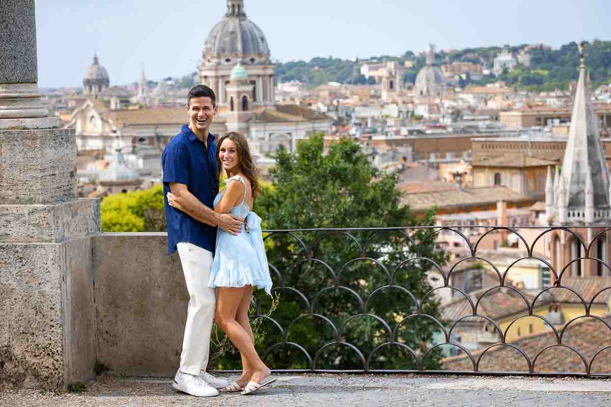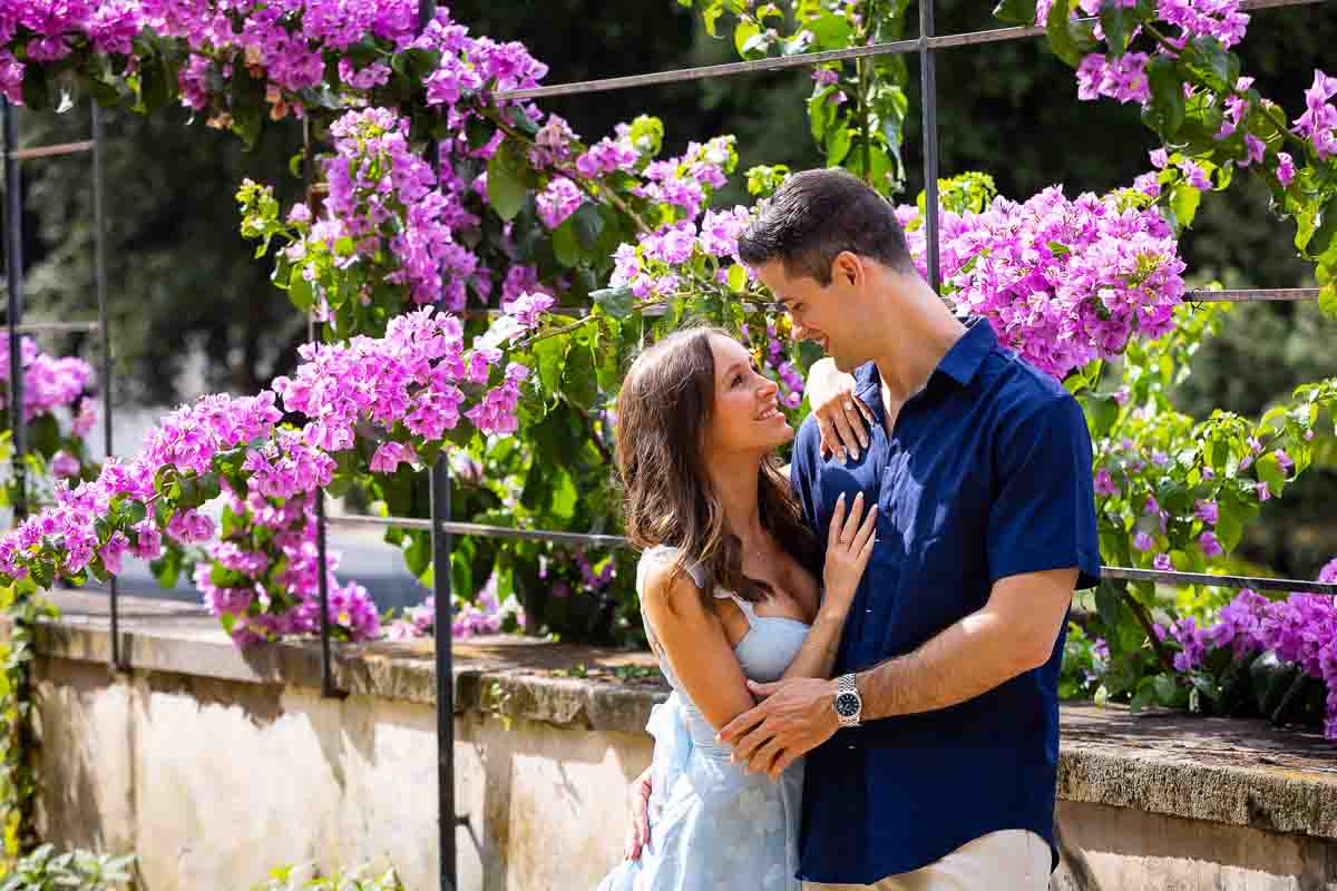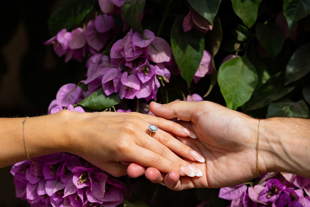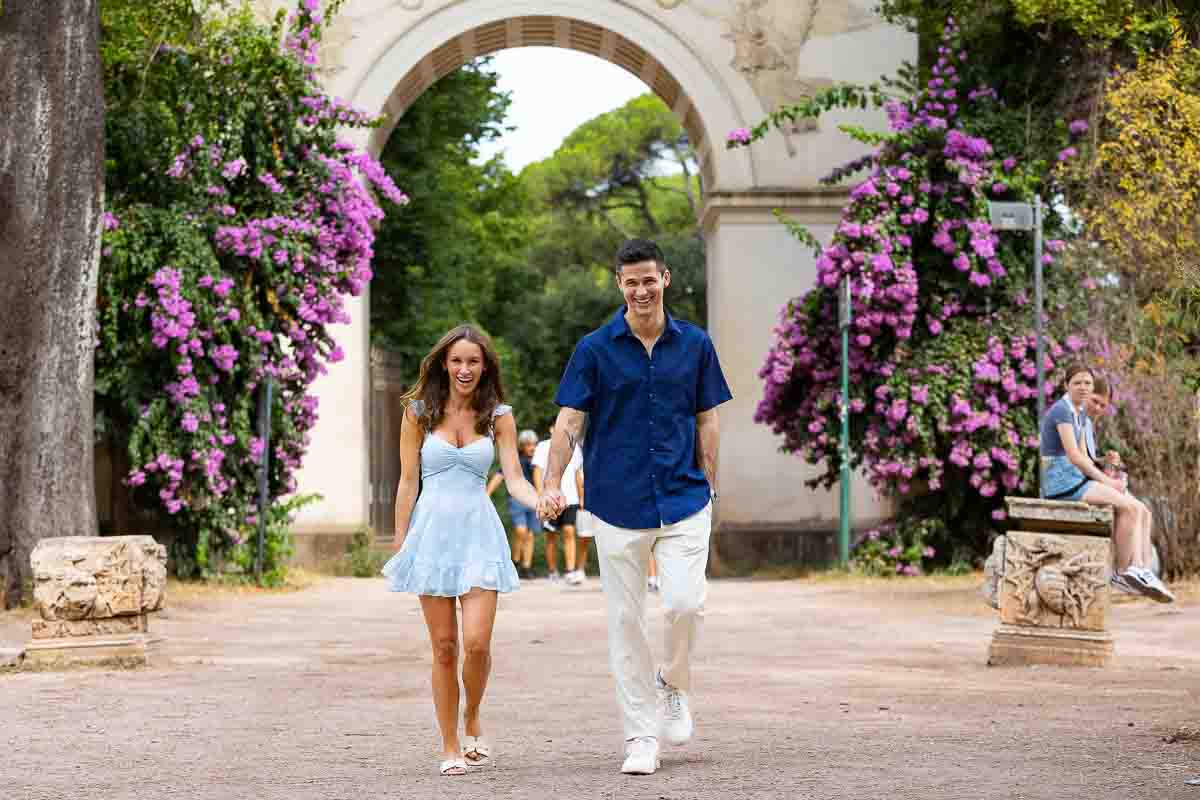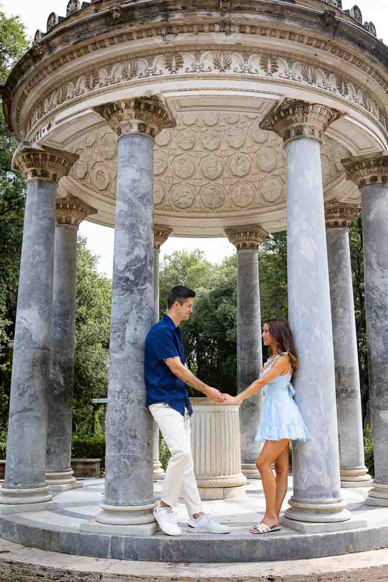 Starting with pictures of the beautiful engagement ring photographed over fuchsia bougainvillea flowers. Which were also used to shoot some nice couple portraits. Continuing on with our engagement photo session by taking some nice walking shots as we made way towards the Temple of Diana. Where we took some posed portraits on the steps and in between columns. With some final shots on the central pedestal. Before heading out to the Pincio park outlook. Where a wonderful sweeping view over Rome’s rooftops was waiting for us!