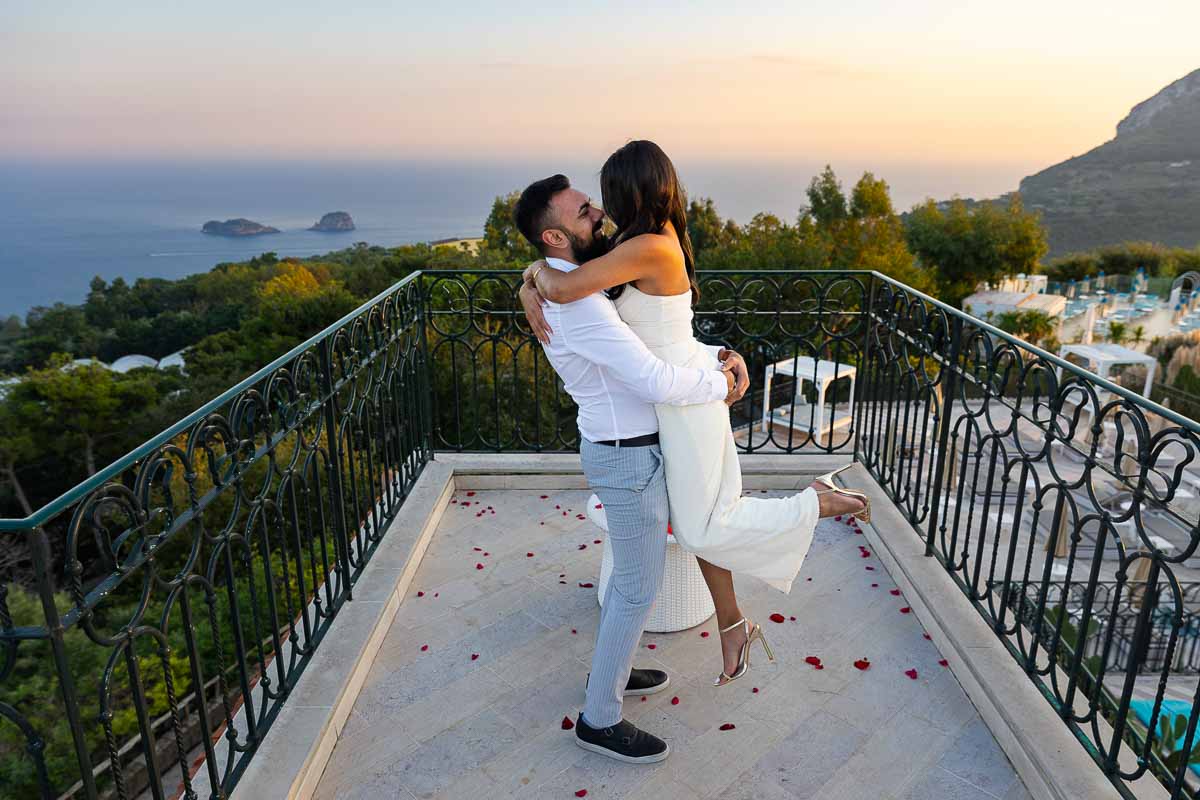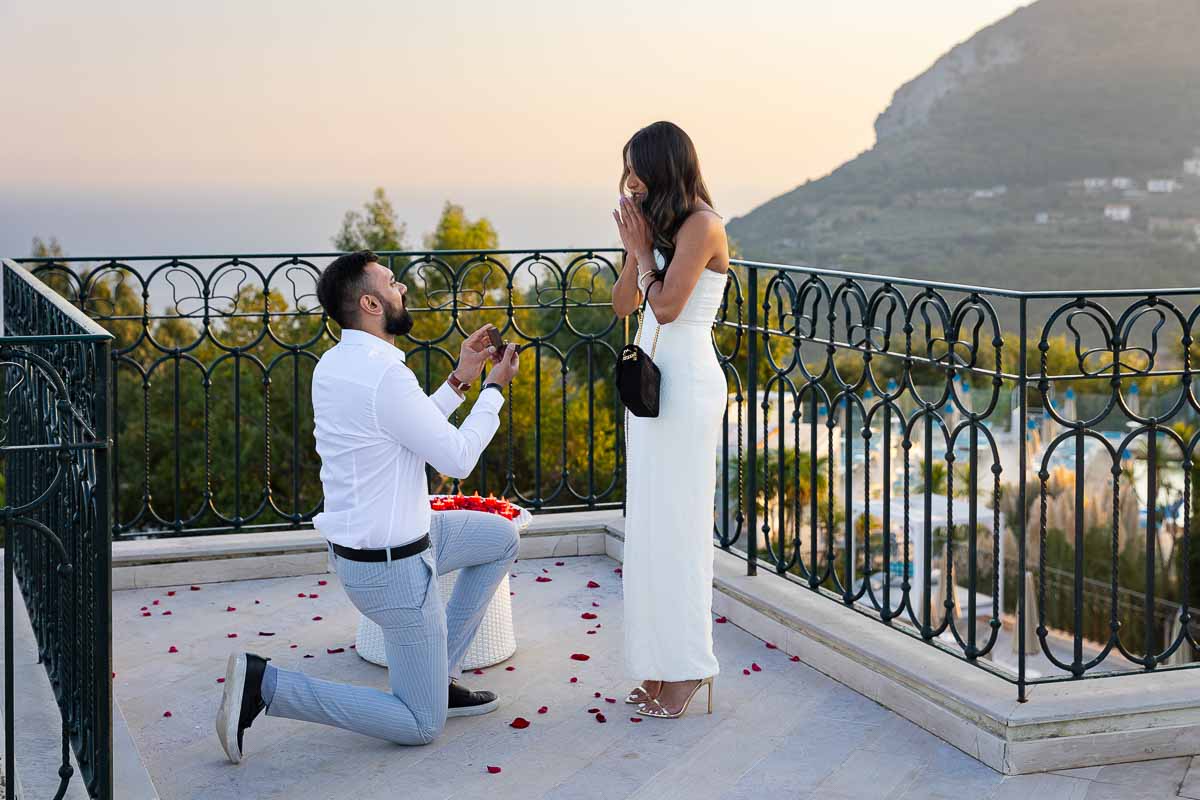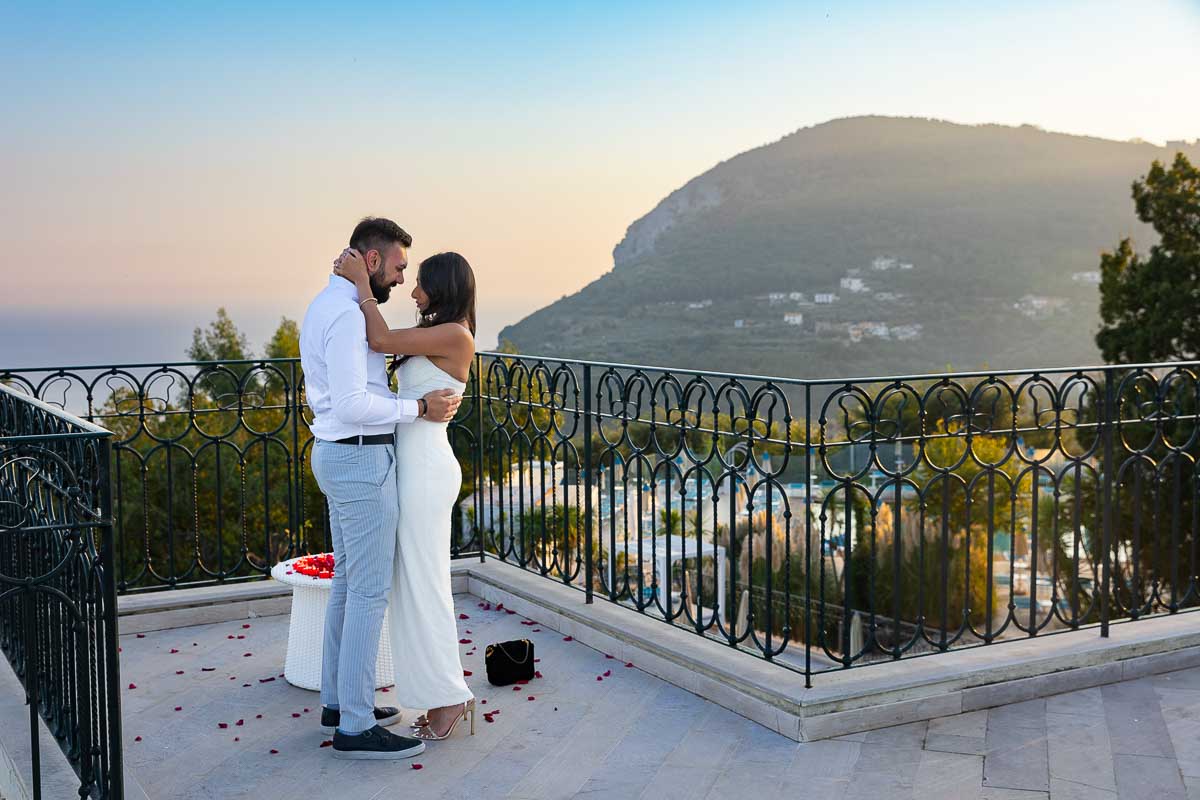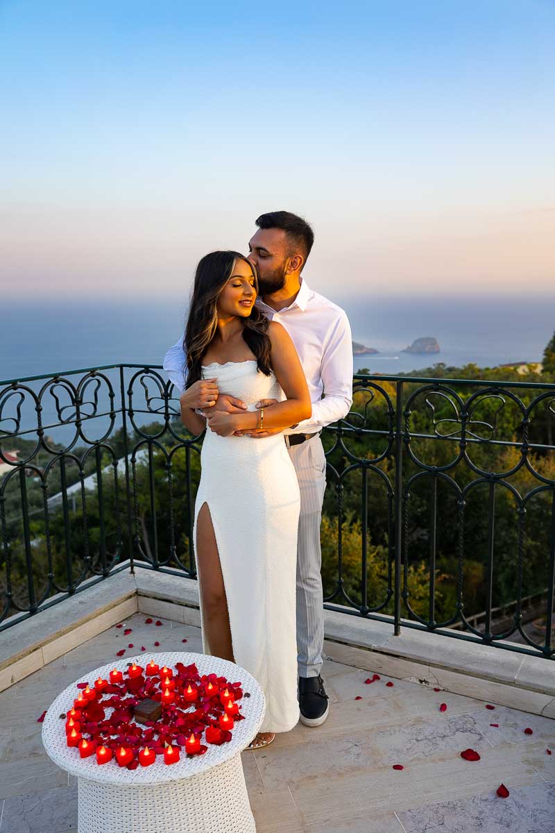 What an amazing Amalfi coast proposal photographer session overlooking the beautiful Sorrentine Coast. Which is found on the other side of the Amalfi coast. Taking place in the beautiful Nastro Azzurro & Occhio Marino Resort. On an amazing semi private terrace with a view over the coast and the sea. Walking up to it and finding a corner table set up with rose petals and red heart shaped candles. A very suggestive view for asking that one special question! With the Amalfi coast photographer at a distance to record this once in a lifetime moment in wonderful photographs. Then after the faithful yes! we popped opened a bottle of prosecco to celebrate! And continued on with some more candid photos as well as some nice posed portraits overlooking the view at sundown.
