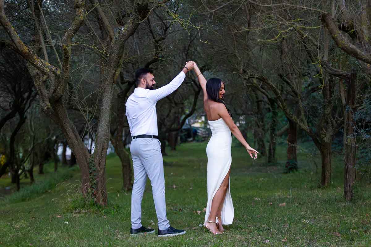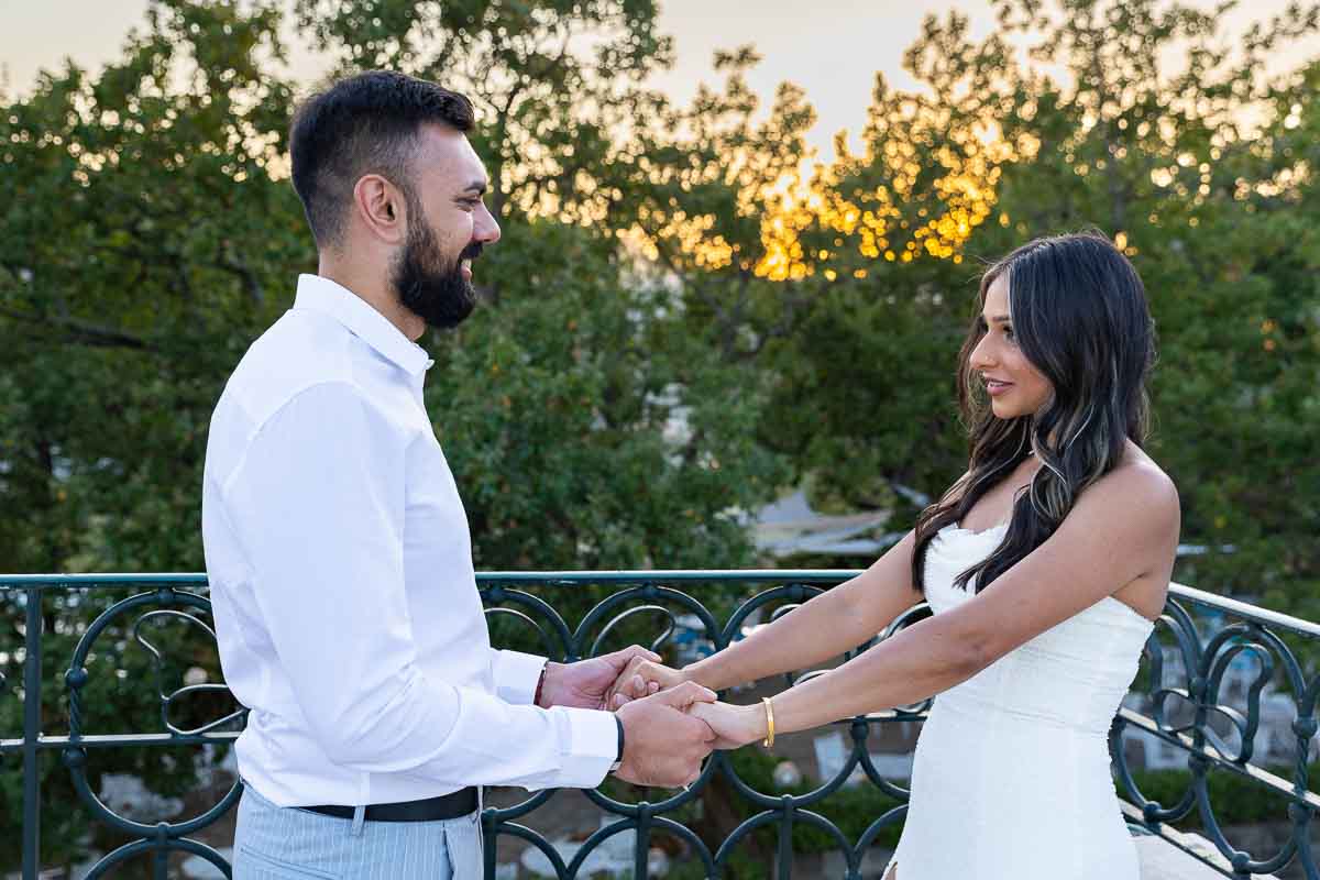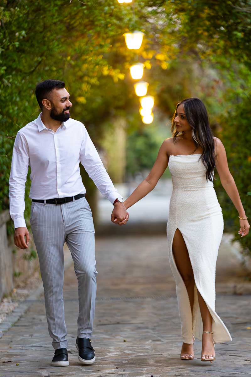 Including pictures of the beautiful engagement ring. Photographed over the red candles and while holding a prosecco flute. Then we moved over to different terrace viewpoints to capture all the fantastic backdrops. With the last rays of light slowly fading underneath the trees and horizon. We then stepped down below and walked around looking for great spots to take pictures. Finding a suggestive portico embellished with nice green leaves and where the lights had just to turned on. Creating a really nice effect. Ultimately capturing a last set of pictures in the garden among greenery and trees.