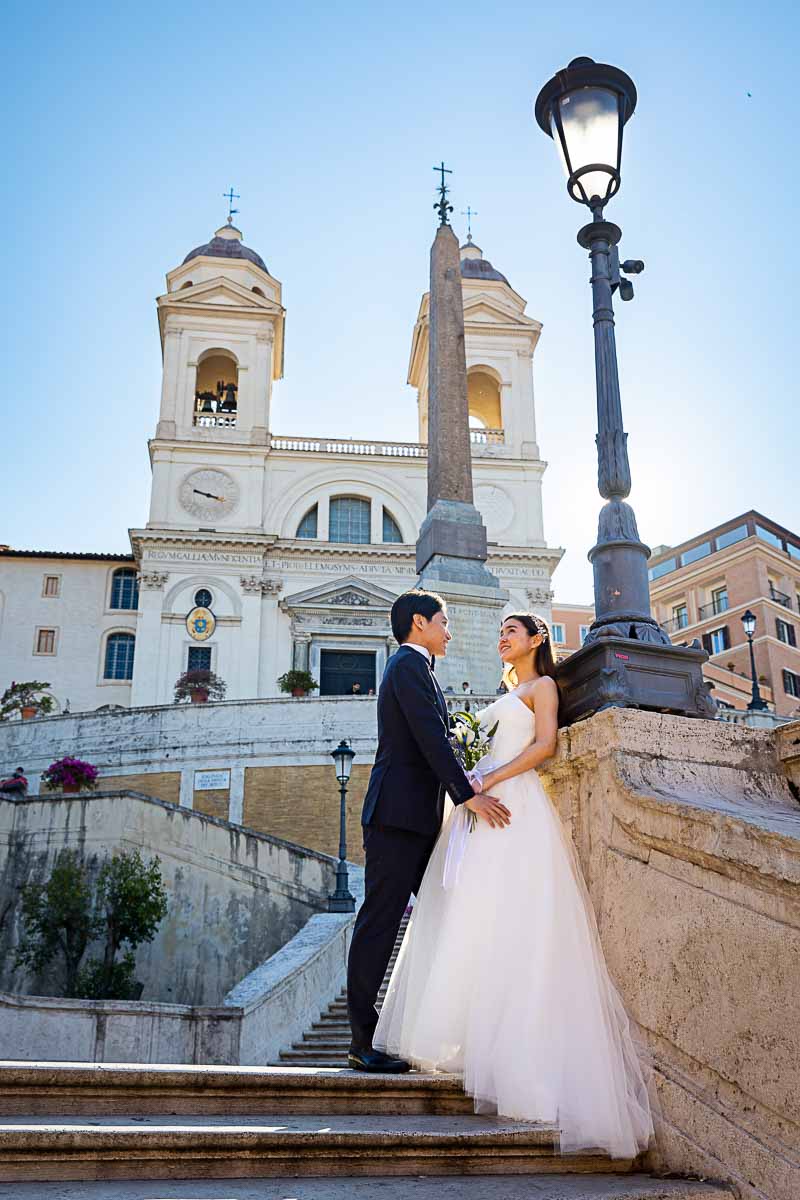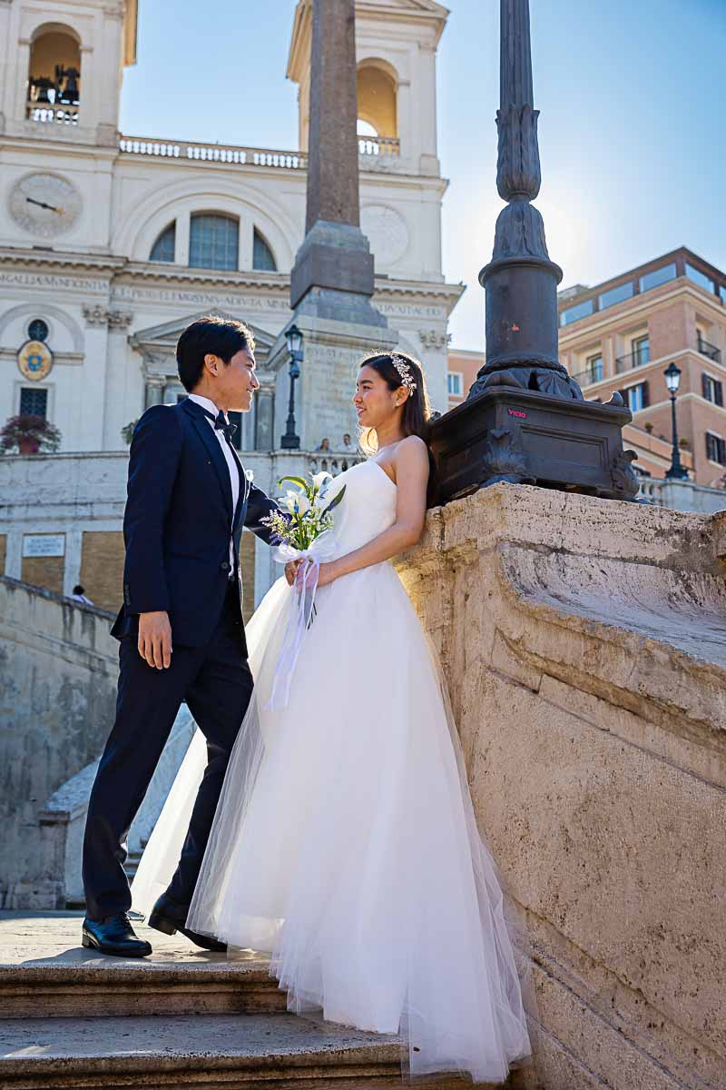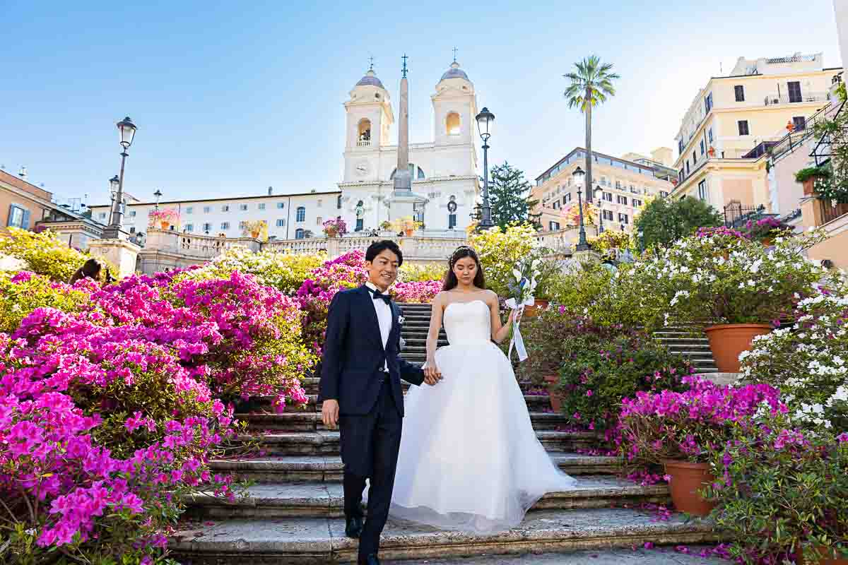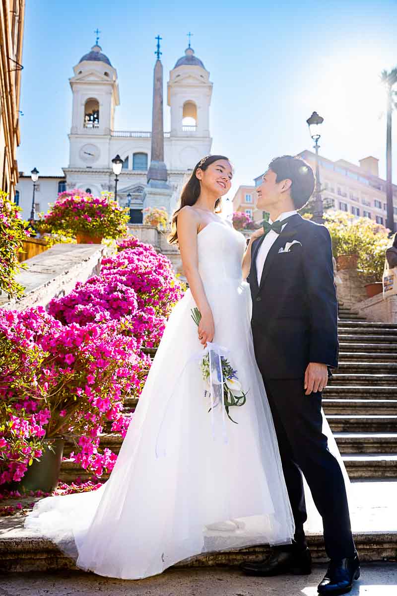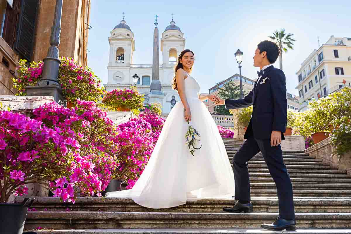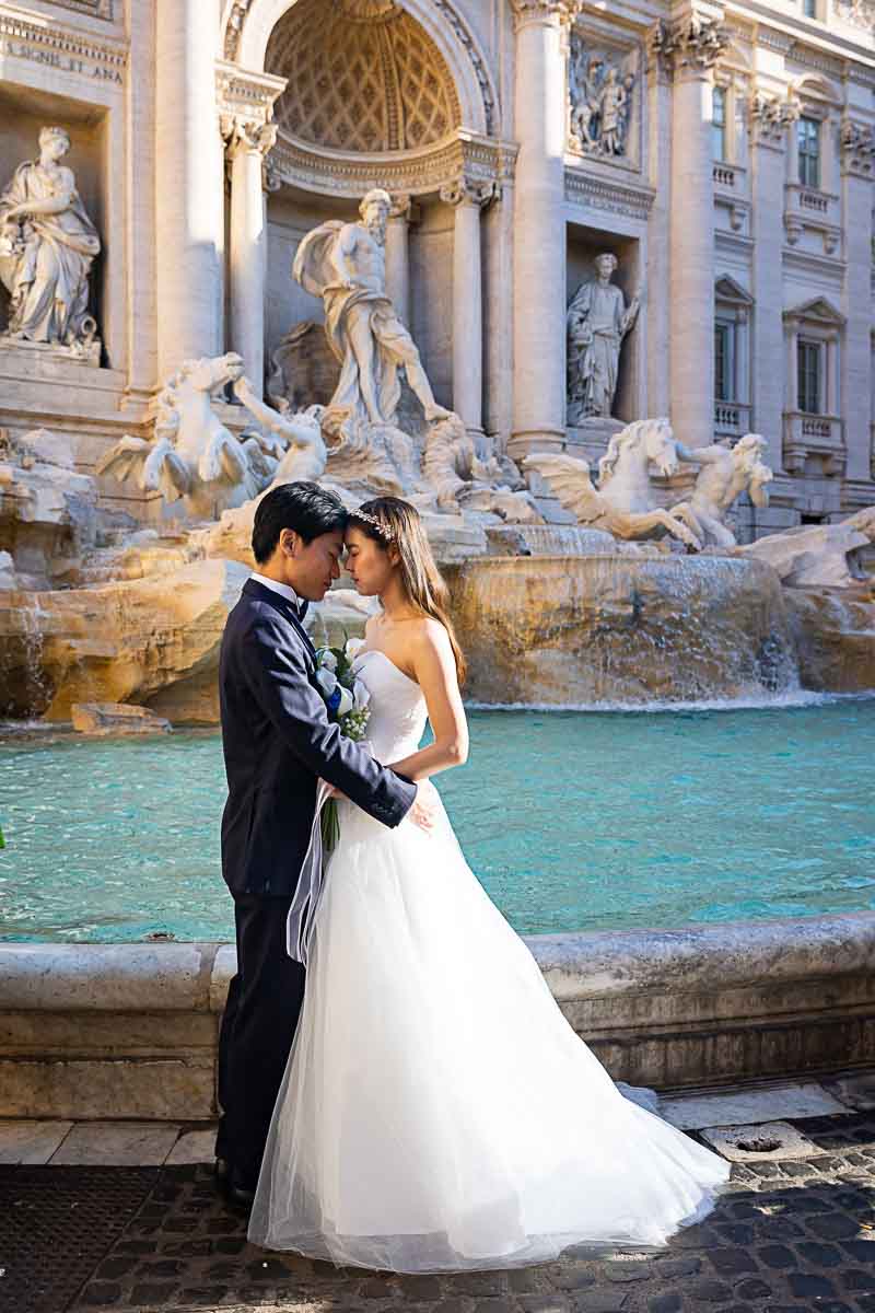 We started this wonderful Rome wedding photographer session in the morning. And we were so lucky to have found such nice weather. Which does help in bringing out the colors and enhance any photoshoot in Italy! Especially on the Spanish steps which were embellished with beautiful flowers to celebrate Spring! Perfect for getting married in Rome! But going in order of sequence. We began taking Elopement pictures in the most scenic location: the Trevi fountain. Which wasn’t excessively crowded. Arriving just at the right time to benefit from nice golden morning light shining through. Going too early in the morning, finds the fountain still in the shade and that doesn’t provide the best lighting conditions for photos. Sunshine has a way to bring out the colors and this is essential to get vivid looking pictures!
