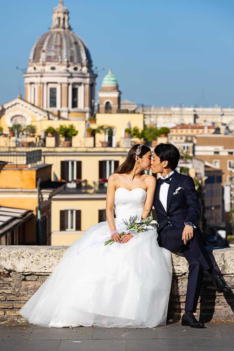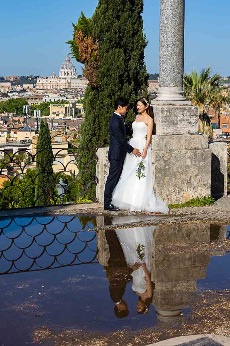 The next logical location was the Pincio Park terrace. Which is located just a little further down the road. With the help of a hired car with driver, essential to easily get in and out of shooting locations in wedding attire. The light here also played a big part in getting nice early morning shots with the city as background. Including some unique photos of the dome of Saint Peter’s in the far distance. Framed by our Rome Photographer in with the water reflection on a puddle from the previous rainy days.