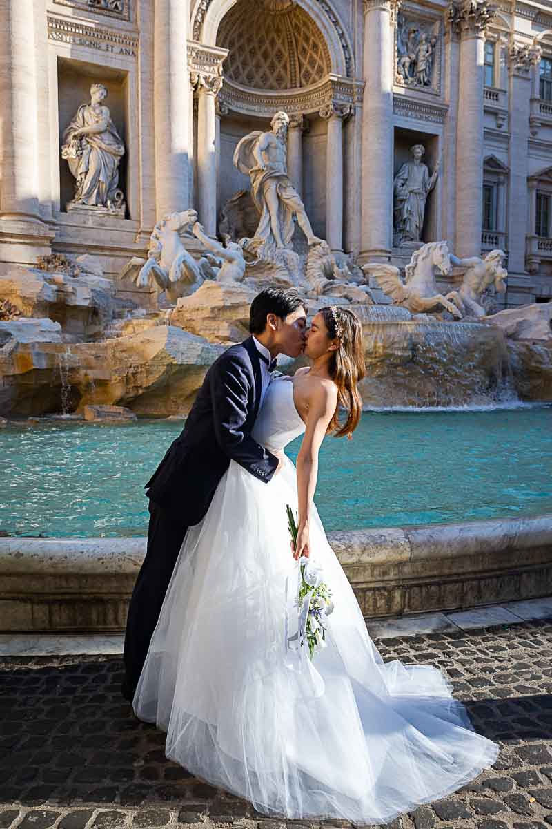 We started this wonderful Rome wedding photographer session in the morning. And we were so lucky to have found such nice weather. Which does help in bringing out the colors and enhance any photoshoot in Italy! Especially on the Spanish steps which were embellished with beautiful flowers to celebrate Spring! Perfect for Pre Wedding Photos in Rome. But going in order of sequence. We began taking Elopement pictures in the most scenic location: the Trevi fountain. Which wasn’t excessively crowded. Arriving just at the right time to benefit from nice golden morning light shining through. Going too early in the morning, finds the fountain still in the shade and that doesn’t provide the best lighting conditions for photos. Sunshine has a way to bring out the colors and this is essential to get vivid looking pictures!