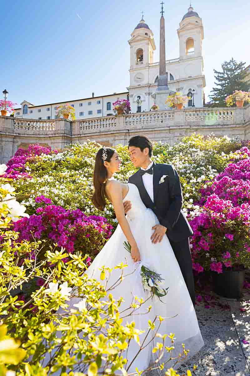 We have no words to describe how beautiful we found the Spanish steps staircase to be. Embellished with hundreds of bright colorful flowers. Traditionally white to match the “White of the Spanish Steps” and lilac. All in bloom with the flowering of the purple azaleas which were mainly located at the bottom of the staircase. Perfect for a memorable pre wedding photos in Rome. So we walked among these beautiful flowers taking unique and creative pictures. Trying to find the perfect pose. While trying to fit in the low rays of sunshine shining through the city. Obtaining in some cases a really nice photographic effect which brought out the true essence of a pre matrimonial photos!