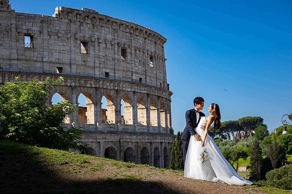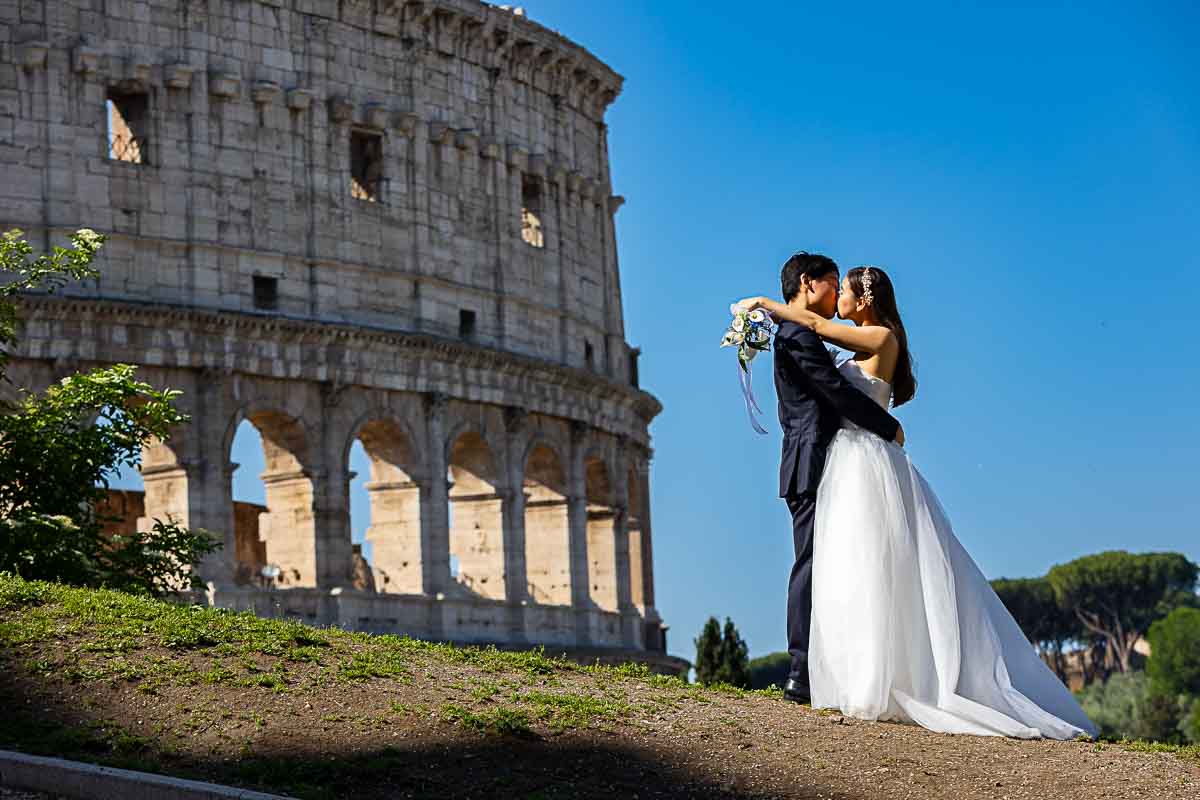 Our last photo shooting location was the Colosseum. Which stood beautifully with all its glory. And again we found just the right pocket of light to bring out some really fascinating pictures. With a deep blue sky. Over the black suit and the white bridal dress. Surrounded by a perfectly orchestrated pocket of shadow light as picture framing. Then it was just a matter of finding the perfect pose!