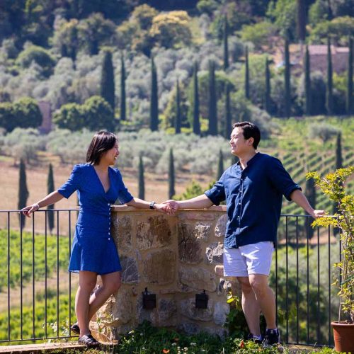 First, the planning begins with our staff and the proposer, discussing the vision, the ideal proposal location, and any specific details to ensure the moment is captured perfectly. This is done on line via email at booking completion of the Tuscany photoshoot. On the day of the proposal in Tuscany, the couple sets out for a romantic excursion, perhaps to a secluded vineyard (see sample Tuscan photo sessions on our blog) on or a historic town, where the magic can unfold against the stunning backdrop.