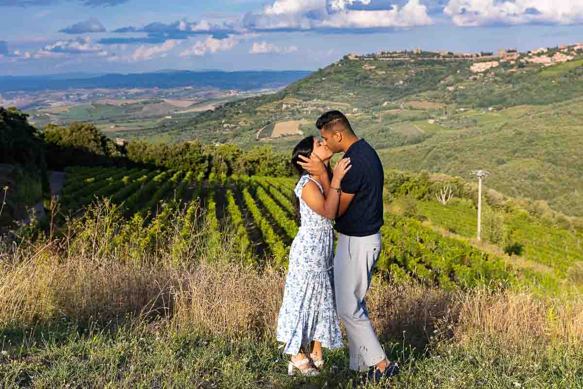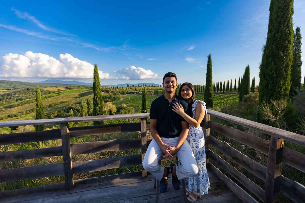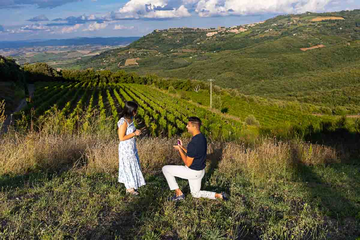 A romantic surprise Proposal in Tuscany taking place at a vineyard during sunset with the beautiful rolling hills in the background! Perfectly set up to take place during a picnic overlooking the scenic Tuscan countryside. With the cue coming from an ‘official‘ photographer approaching and asking to take a couple portrait picture as a complementary souvenir from the winery! Excuse which worked out well to get in the perfect position to Ask the Big Question in the Tuscan countryside!