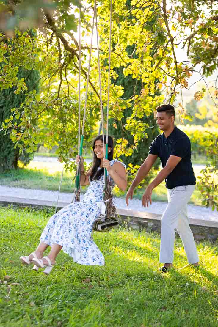 Question which was welcomed with a lot of Joy and Happiness! A great sensation which carried us through the engagement Tuscany photo shoot that followed in around the vineyard and countryside. Where we found so many amazing photoshoot locations. Where we tried out different poses lit by a fantastic sunsetting light. Including a nice stroll through the vineyard, taking pictures among the vines. As well as taking a nice walk on the the road leading into the winery with the characteristic tuscan cypress trees on the side. Then we concluded the photography session with some final pictures on a swing near the country house!