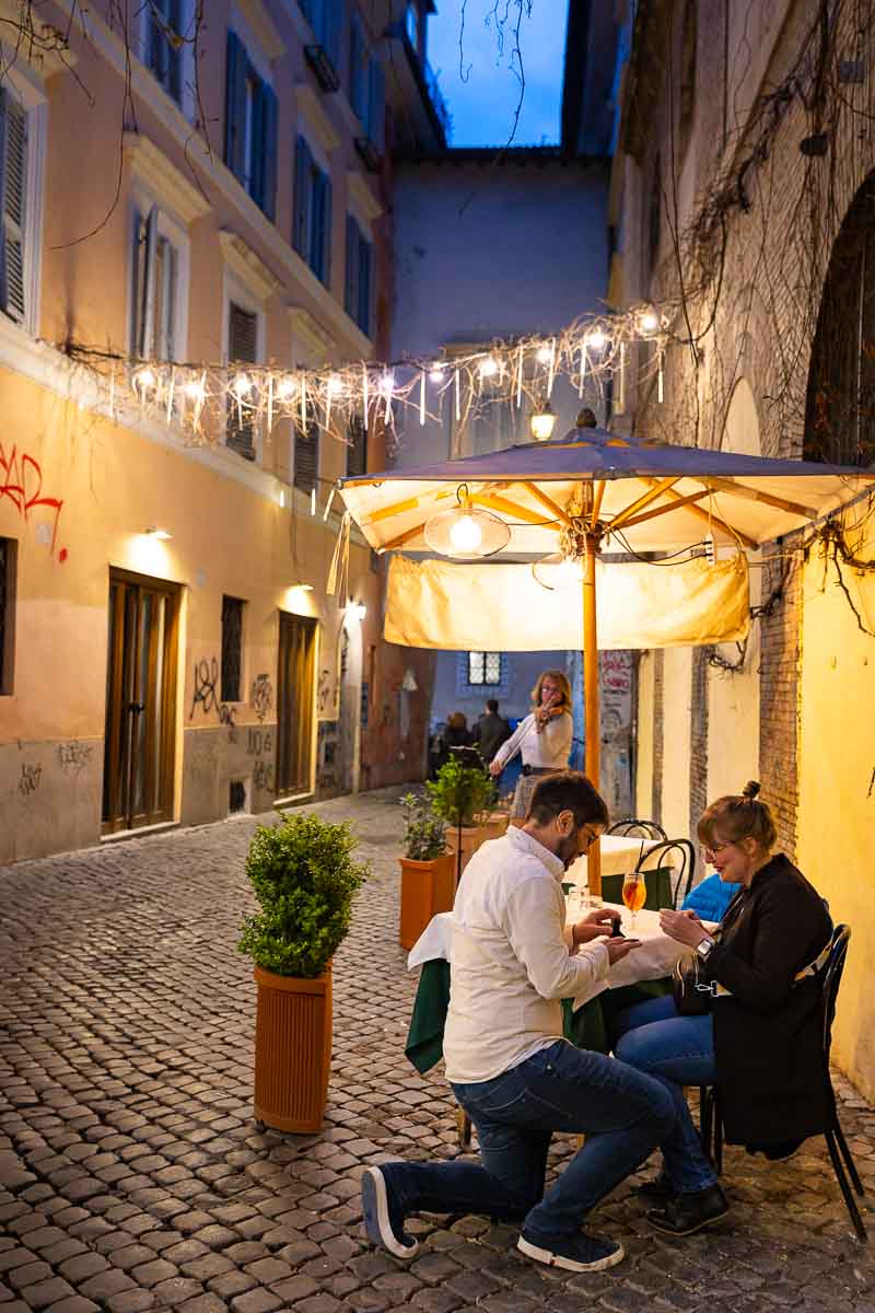 What a romantic rendezvous at a local restaurant in the Trastevere quarter of Rome. Everyone meeting there directly at 8:00 pm. Reserving an outdoor table to have drinks. But most of all to have the opportunity for the violinist to play a romantic song for the surprise wedding proposal proposal. Proposal which perfectly worked out in its surprise effect! Followed by a great deal of joy and happiness. And the exchange of the beautiful engagement ring. And to the sound of clapping hands coming from the staff of the restaurant which was very helpful in coordinating the table and the waiters.