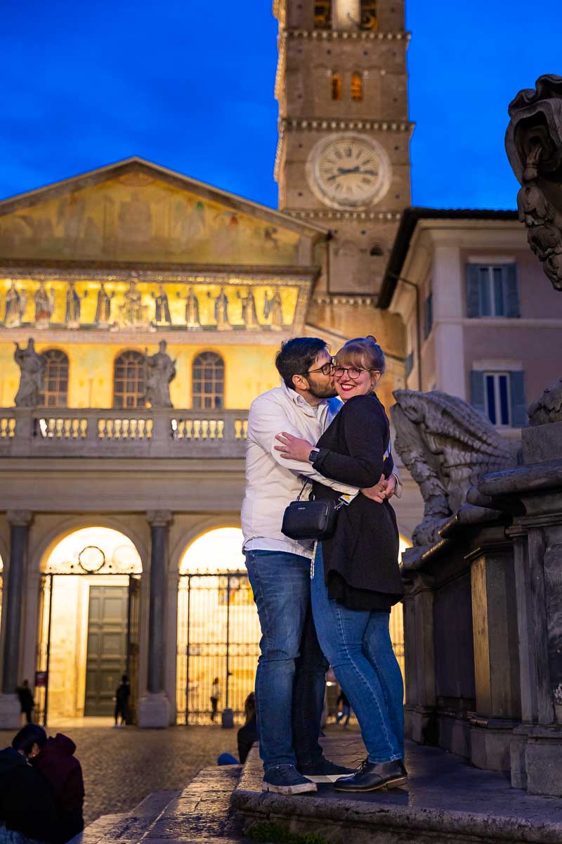 From there we took a small walk around the block to take some nice engagement photos in Rome. Starting off at a typical roman street corner, well lit for lifestyle photography. Giving off such a great mood! Reaching the nearby Piazza Santa Maria in Trastevere to take some nice spontaneous portraits. on top of the steps of the central water fountain that characterizes the square. And ending the photoshoot with some silhouette shots taken around the corner!