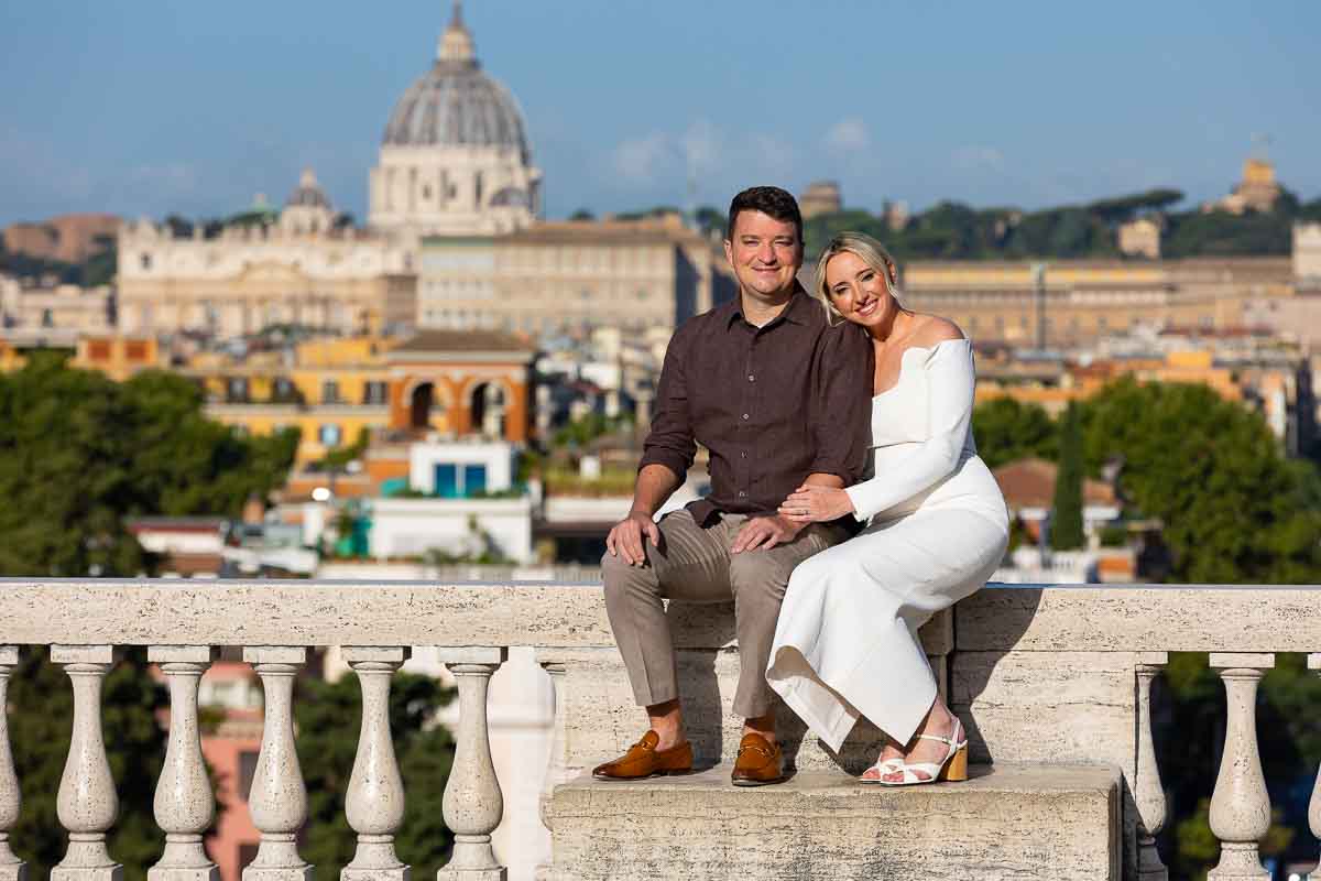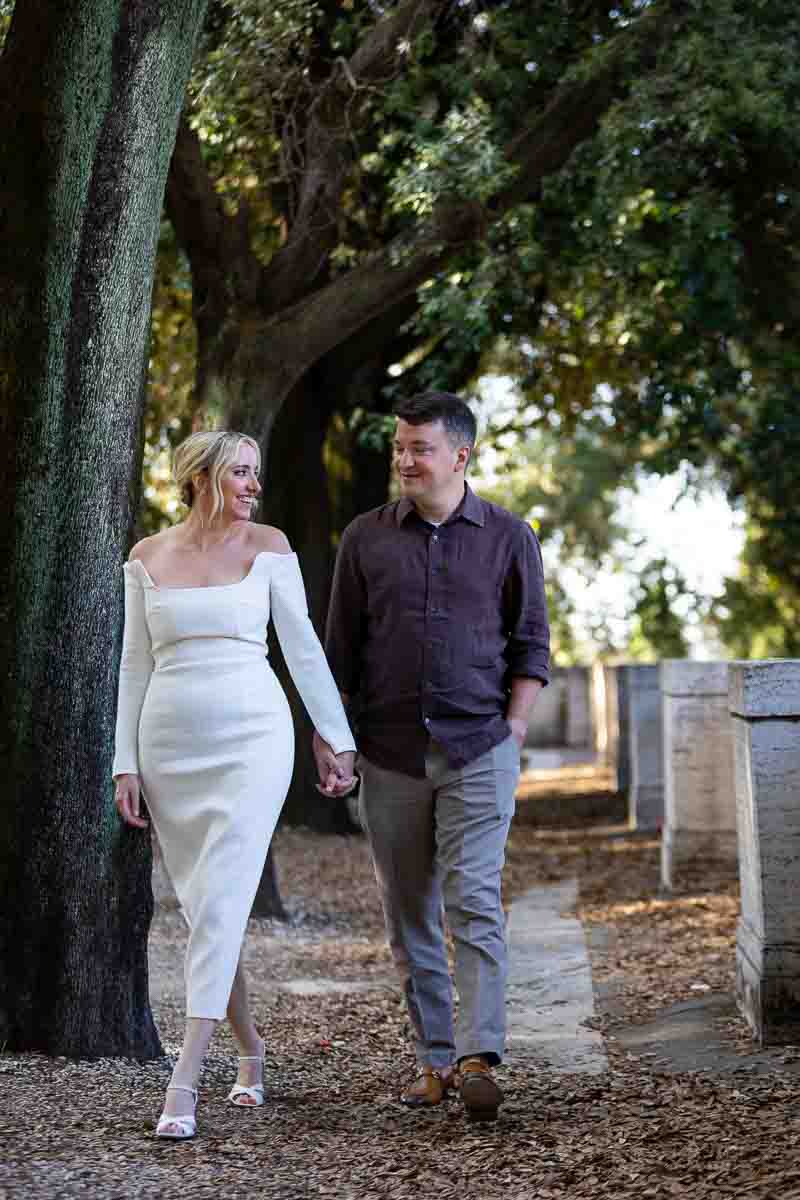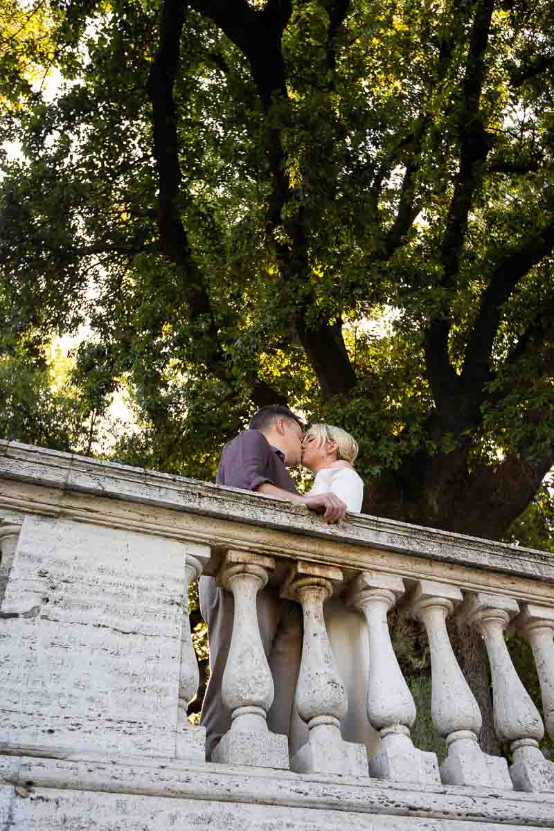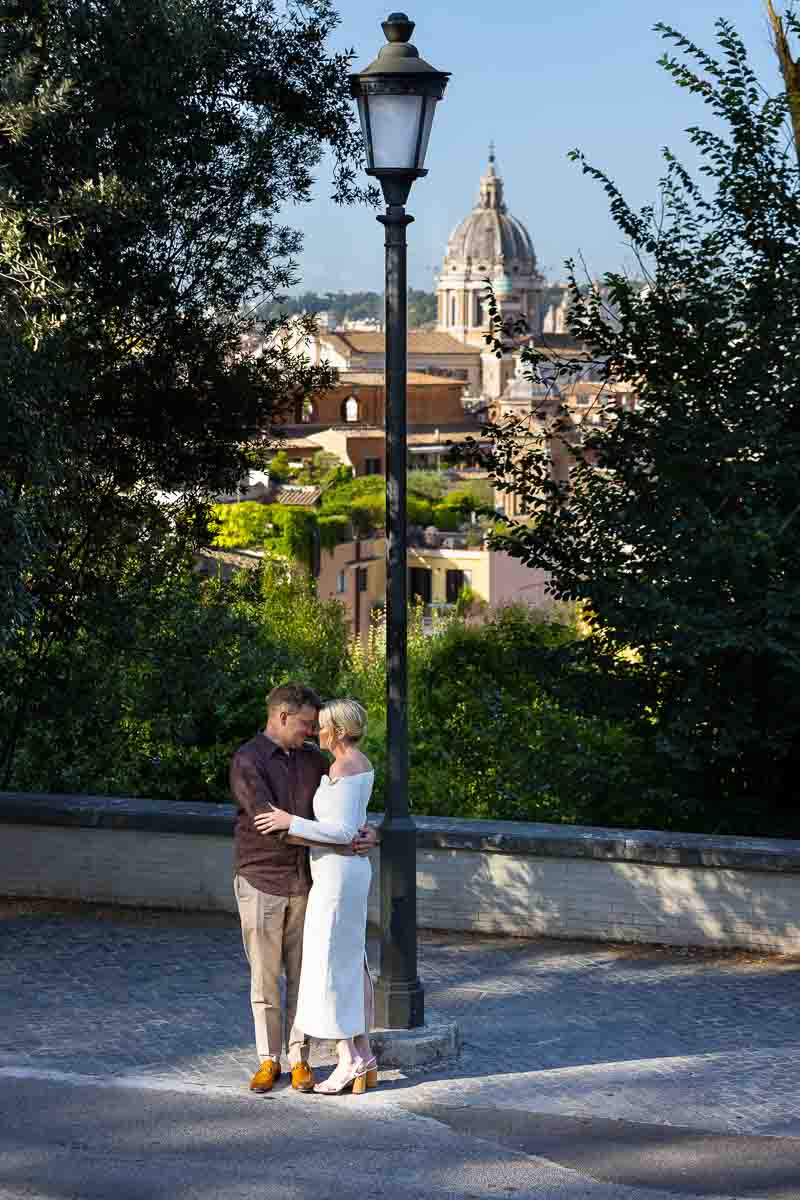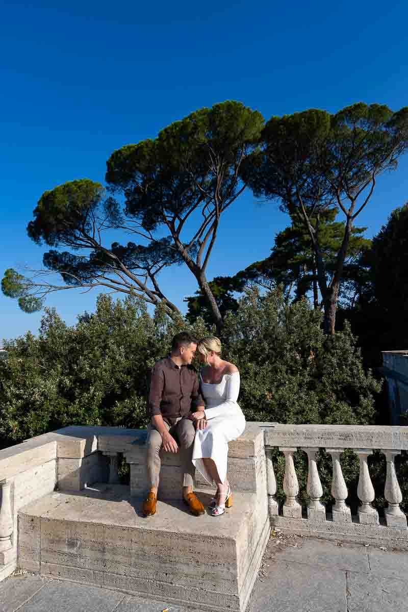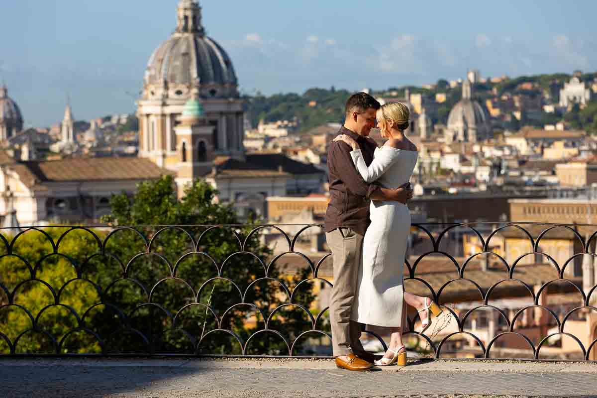 A very beautiful and pleasant engagement photo shoot starting in the morning from Parco del Pincio. Where we began shooting on the marble terrace which has phenomenal light in the early morning. Trying out different poses and shifting the shooting angle to also include the very high Mediterranean pine trees which are so typical to see in Rome and throughout Italy. Then we moved over to the adjacent terrace view. Stopping to include some nice posed pictures by the park trees as well as some walking shots. Reaching the second terrace to find a nice pocket of light where we could take some nice artistic photos with a different perspective on the roman skyline.