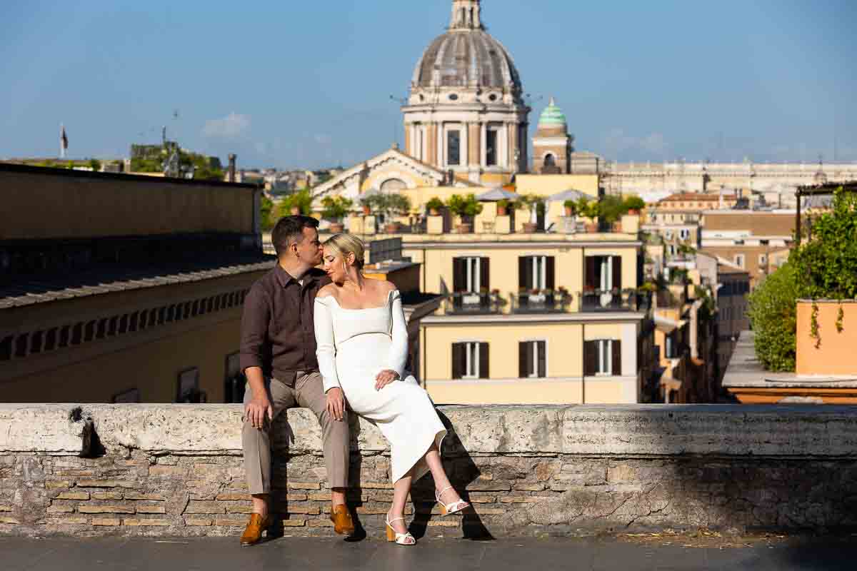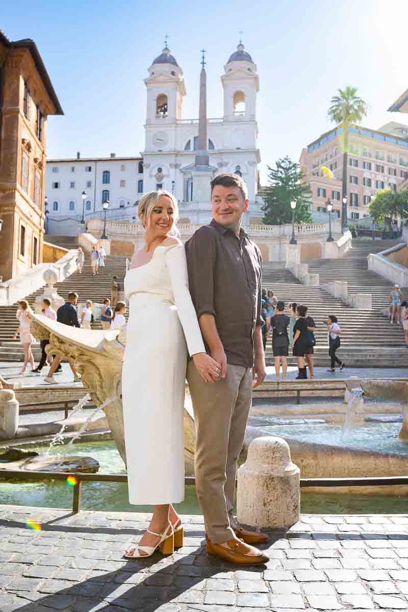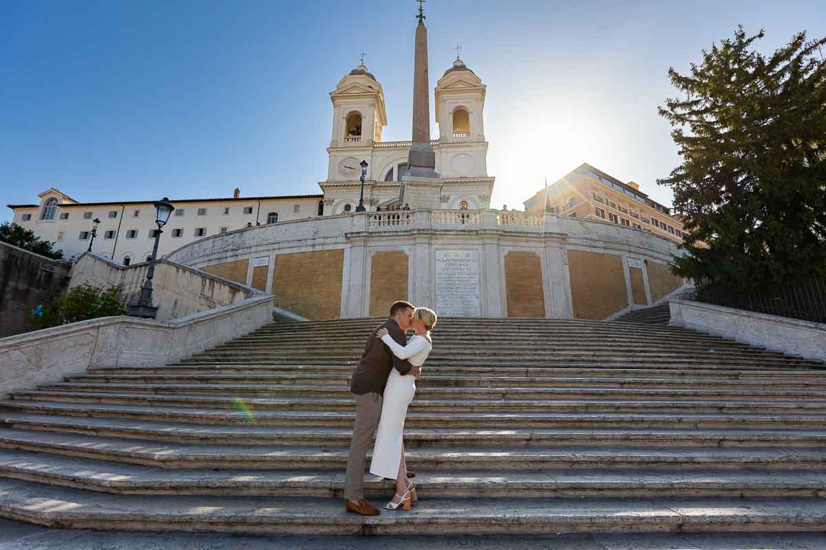 Ultimately reaching Piazza di Spagna. Where the light was just phenomenal! And enable us to capture some truly remarkable engagement photos in Rome. Photographed on the empty staircase which is a rare opportunity in central Rome. With beautiful sunrising light shining from behind the couple. Then we made out way down to the bottom of the Spanish steps. Where we stopped to take pictures in around the Barcaccia water fountain.