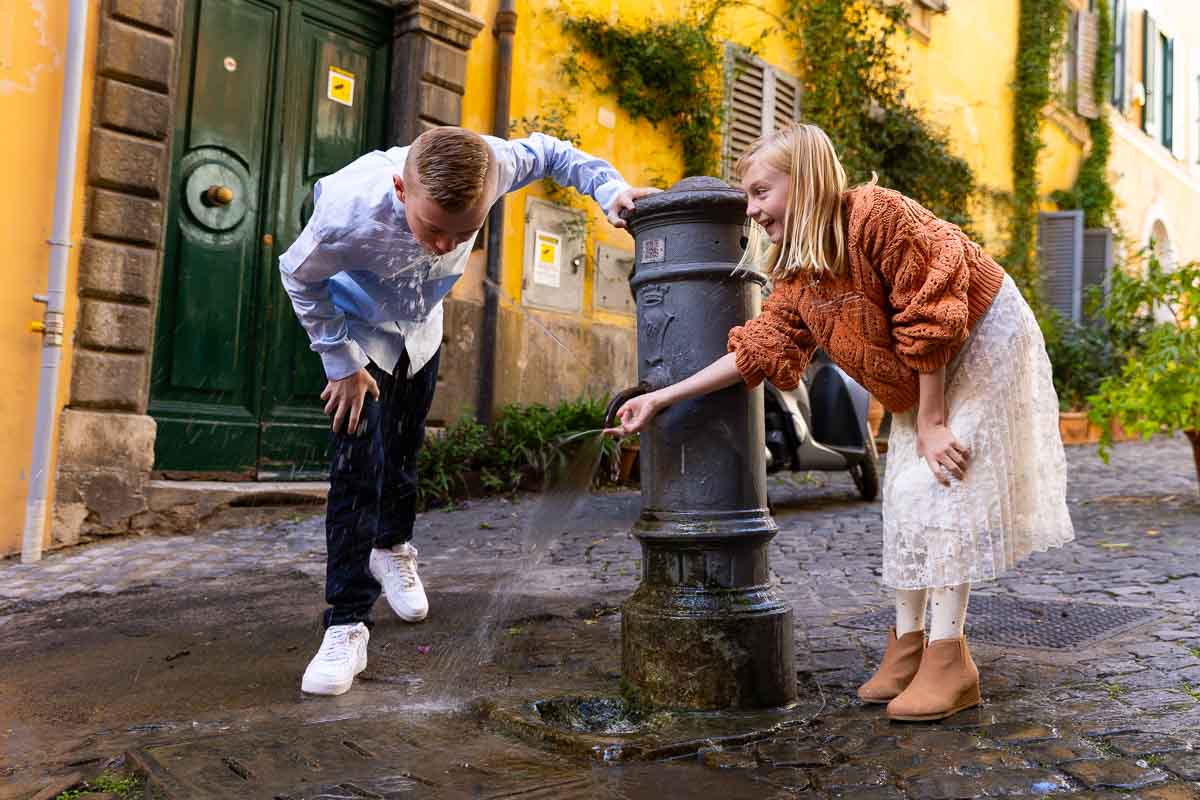 Then we took a walk to reach a nearby cobblestone alleyway. Which has the Coliseum as the perfect background. Here we took some walking group photos. Before visiting the Monti quarter. Which is a short 5-10 min walk from the Coliseum. And which provides some truly authentic roman views. Among old street corners and a doorways that an experienced local local photographer knows! Including some fun picture while drinking from a street water fountain!
