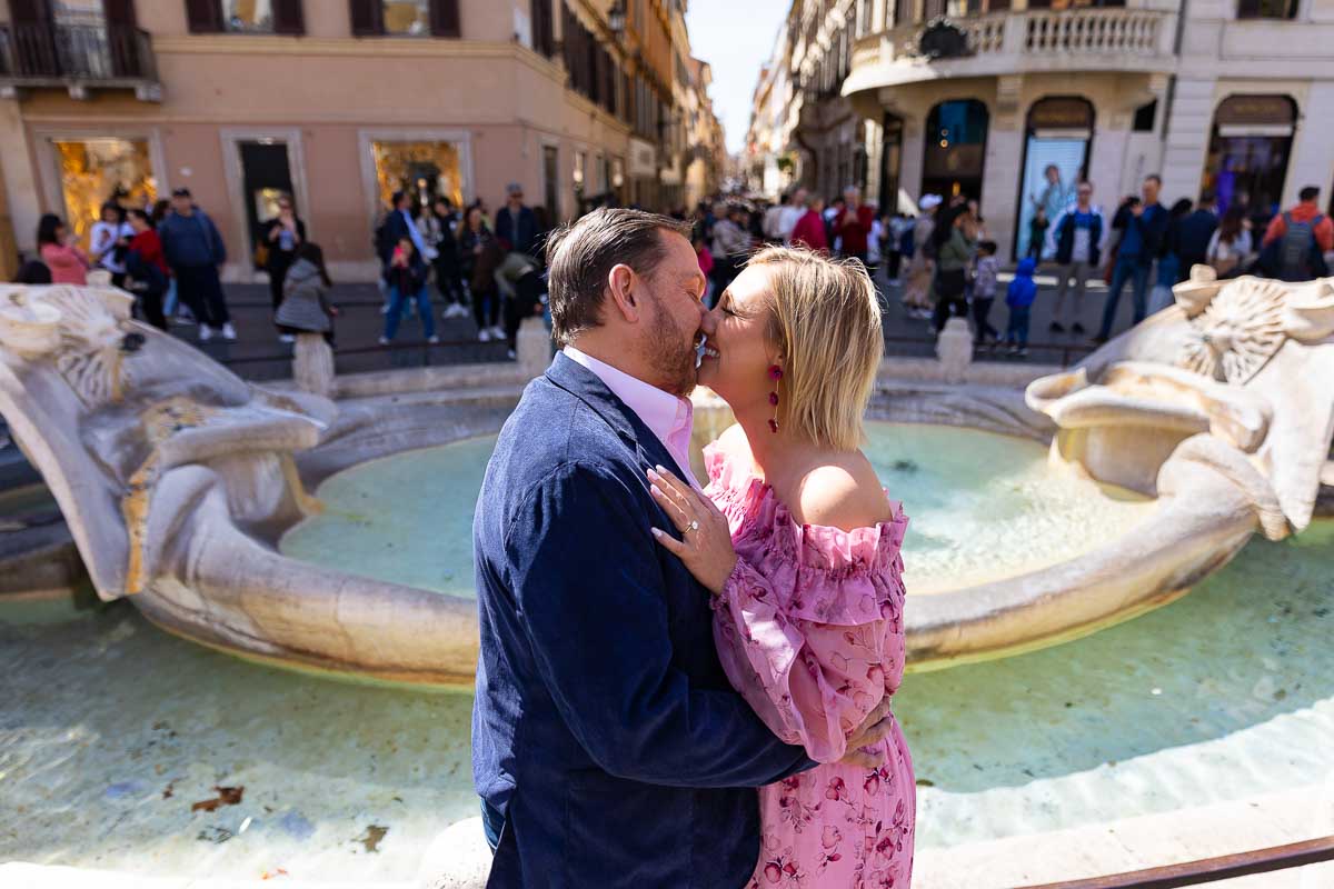 Couple kissing by the Barcaccia water fountain with the subject in focus and the background out of focus