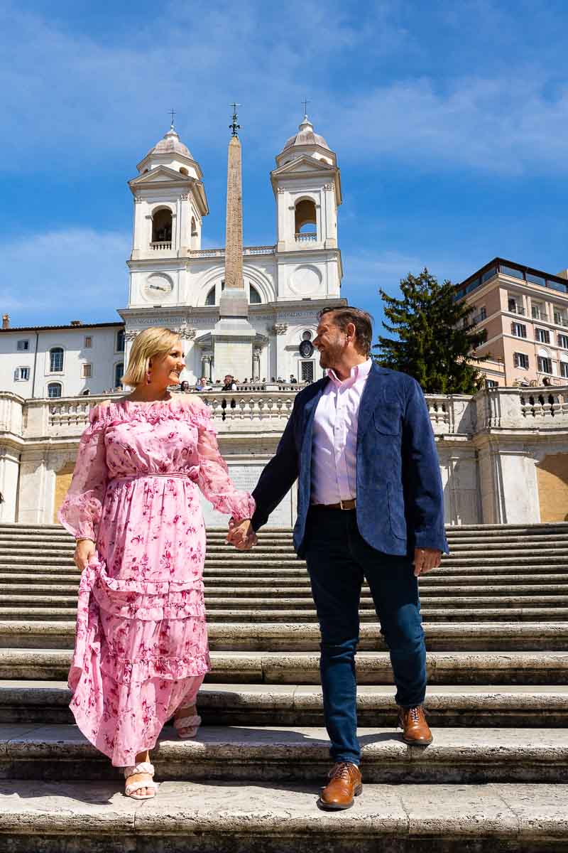 Couple walking down the Spanish steps staircase holding hands while on a photoshoot
