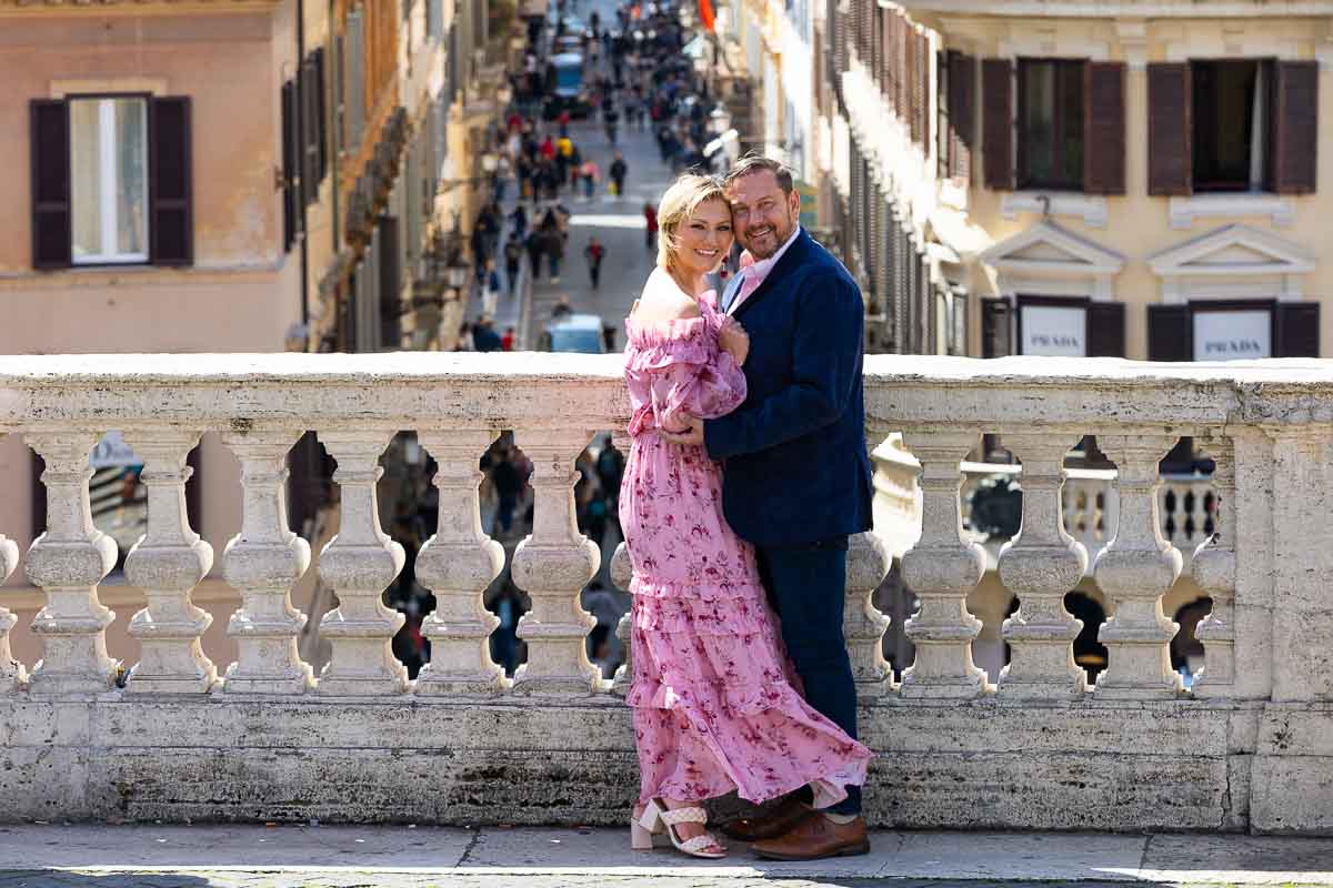 Portrait picture of a couple posing in front of the marble balconade found at the Spanish steps in Rome
