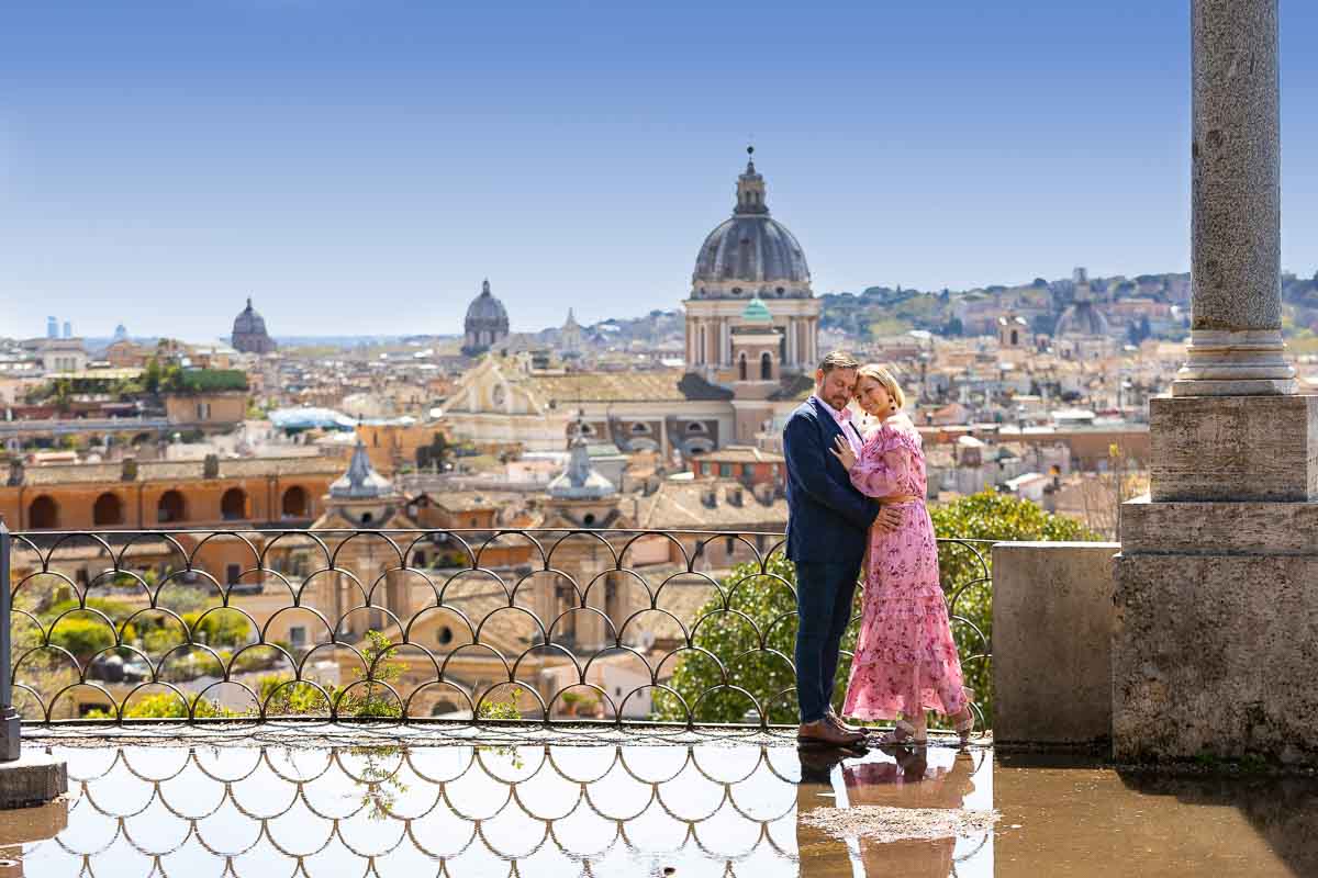 Walking and kissing together on a rooftop terrace with an incredible view of a church in Rome