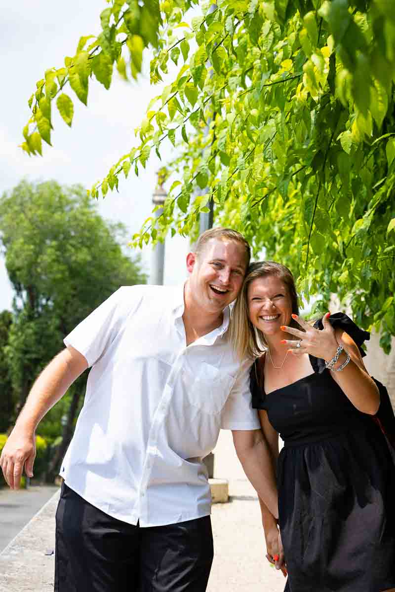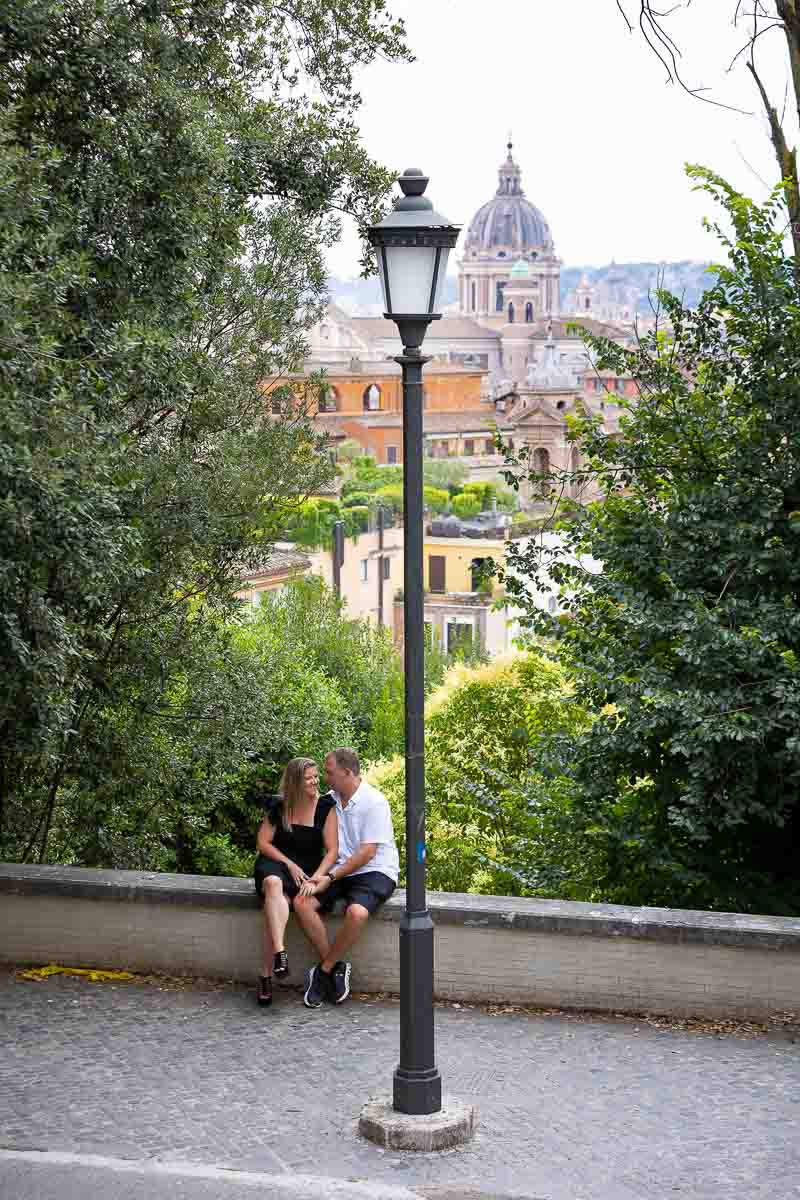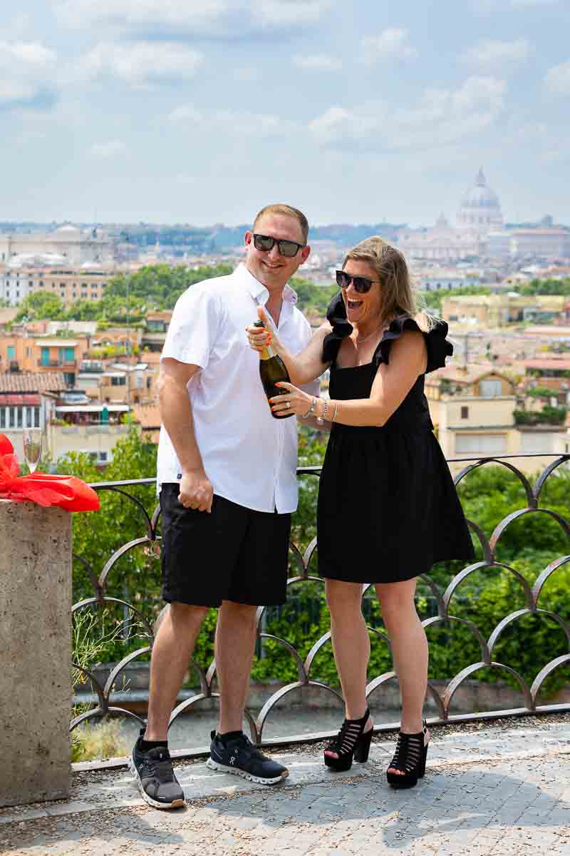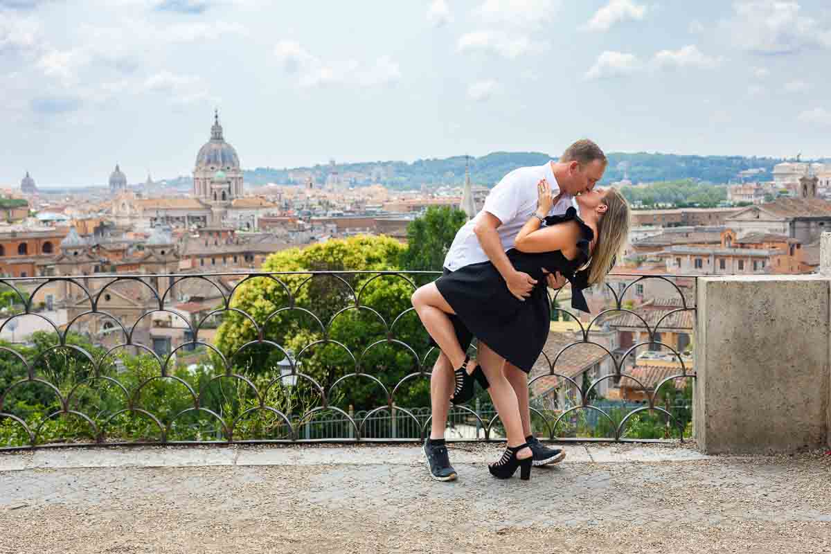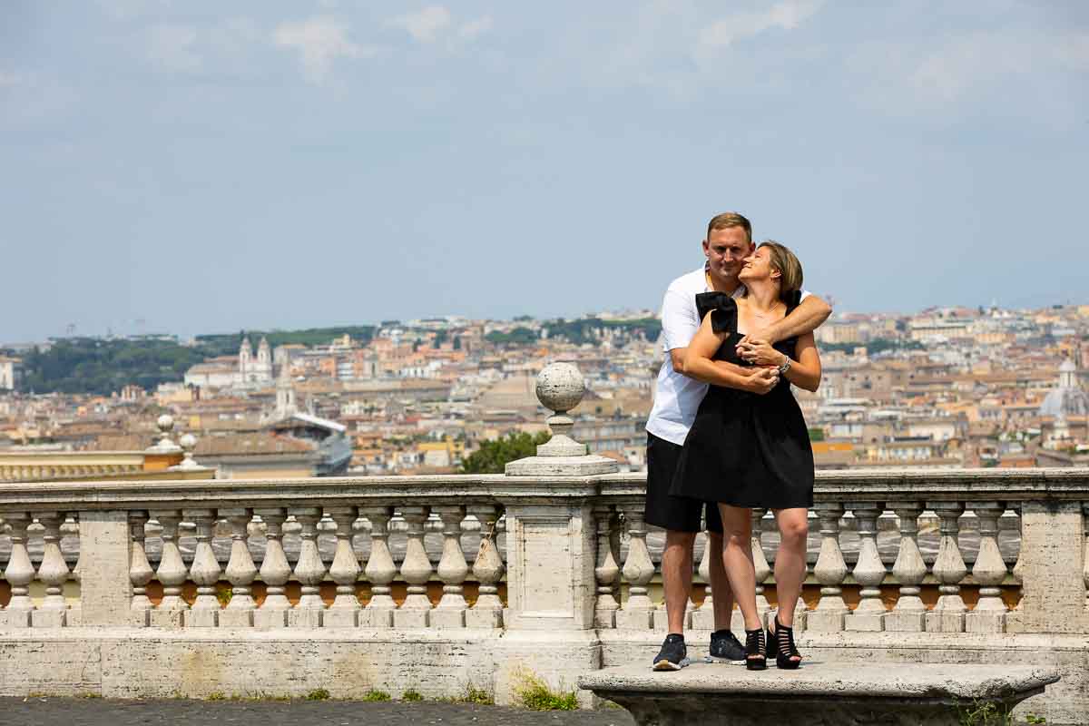 A beautiful and romantic surprise Proposal Photographer Rome service set up to overlook the Eternal city from the above Pincian hill. Reaching the Villa Borghese park by car service. And finding a sweeping view over the ancient city. A perfect location to ask the Big question! Especially with romantic violin music which soon changed into a serenade to accompany the wedding proposal! Question which was followed by a lot of Joy and Happiness! And after catching breath from the great surprise. We celebrated with a beautiful bouquet of red roses and a bottle of prosecco sparkling wine! Meeting with the Rome photographer and his trusted assistant to continue on with the engagement Rome photoshoot. Taking some nice couple happy portraits in different spots of the terrace. Catching different angle views.