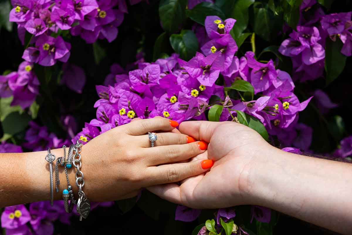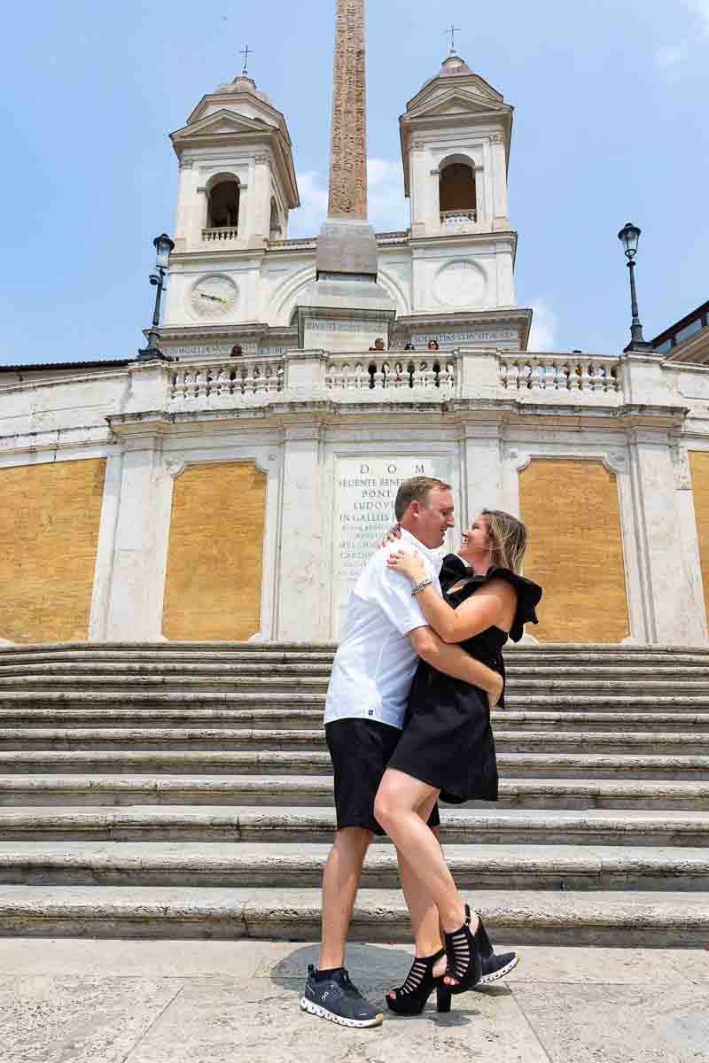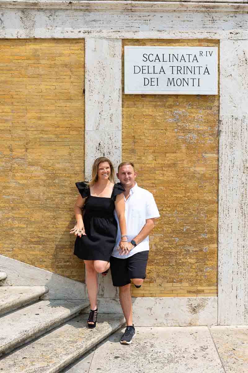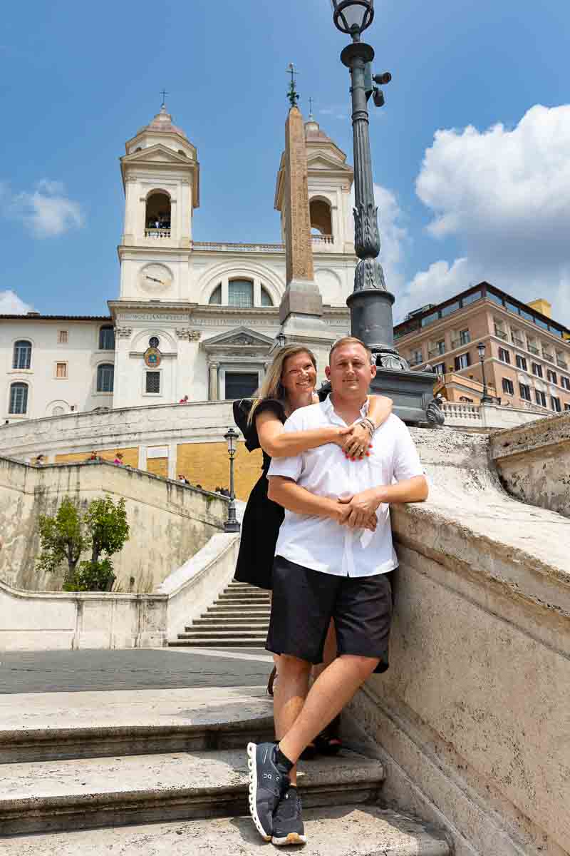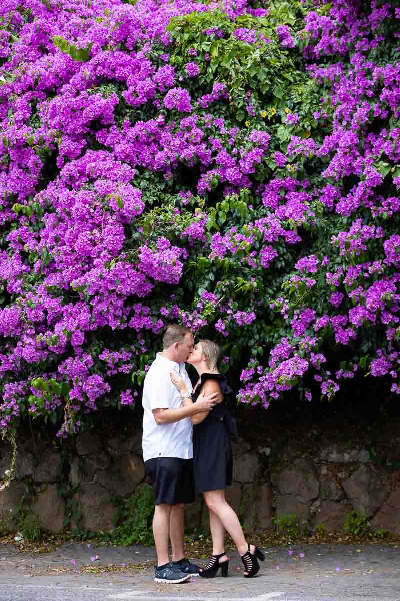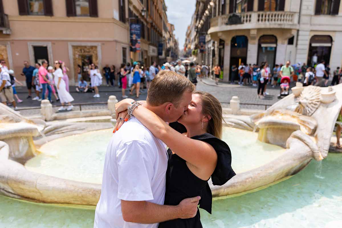 Then we took a photo nice walk towards the Spanish steps to continue with the Rome Surprise Proposal Photography. Stopping along the way to catch different background glimpse of the city. Including some nice bougainvillea plants shot which we found along the way with bright colorful fuchsia flowers. A perfect backdrop for couple portraits and engagement ring pictures! Ultimately reaching Piazza di Spagna to take some nice portrait pictures on top of the steps and all the way down to the Barcaccia water fountain. Where we snapped our last shots before jumping back in the van to continue to our next location.