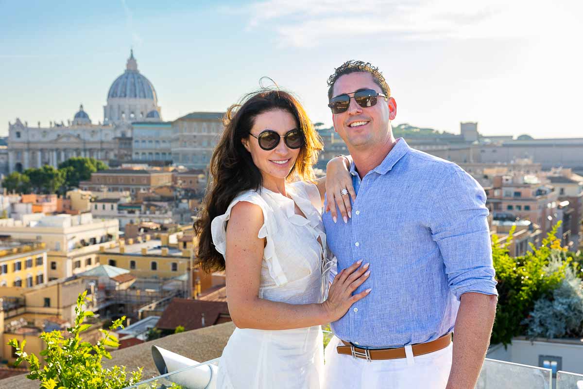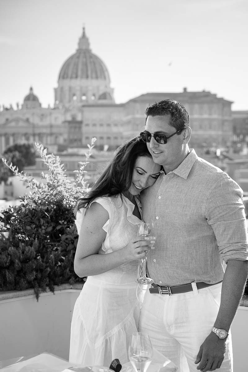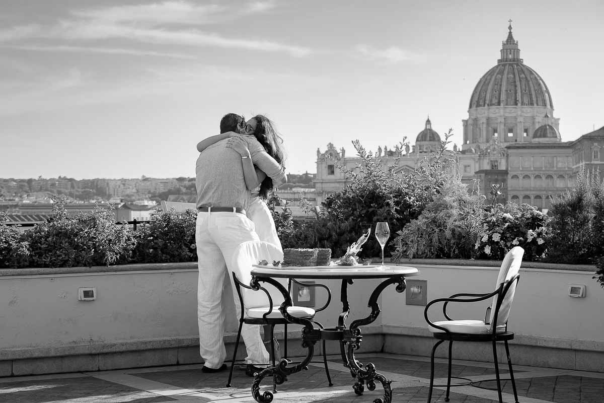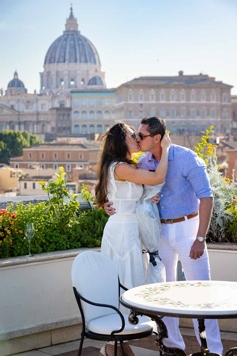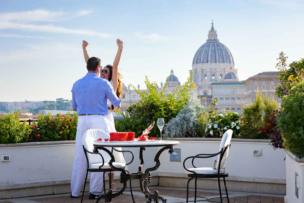 Overlooking the Eternal City from above. A fantastic wedding marriage proposal perfectly organized to take place in one of Rome’s most scenic terraces. Arriving to find the whole place just to ourselves! And while enjoying a close up view of Saint Peter’s Basilica. With some many architectural details which are otherwise unnoticeable. Then a bright red heart shaped cake arrived and was placed on the table just behind our couple. With one of the most important question written on it!