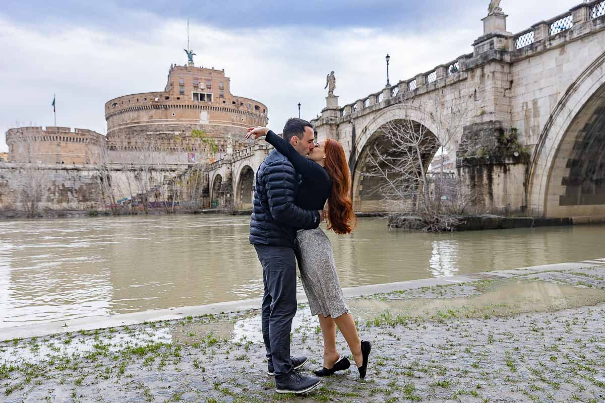 Engagement photo session down by the Tiber river level with the Castle and the Bridge in the far distance
