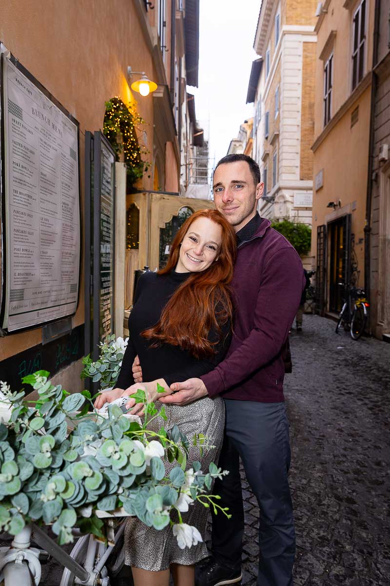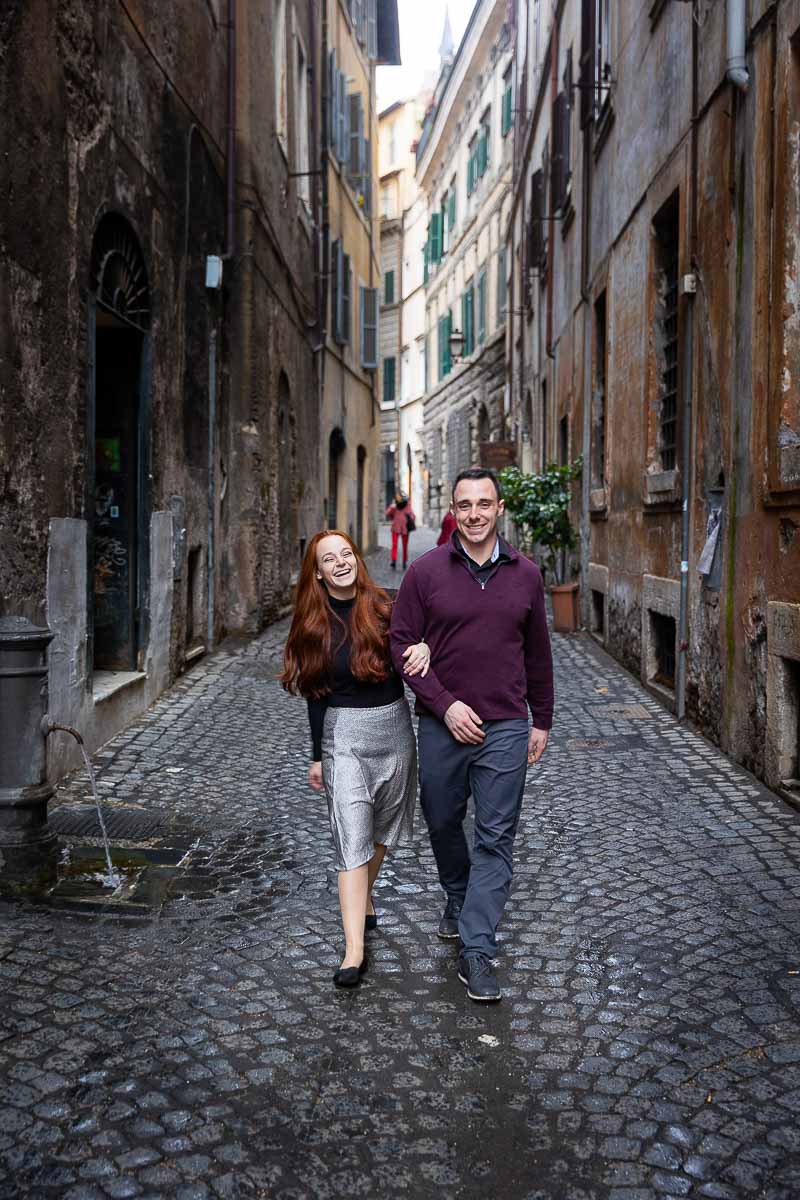 We then headed to Via Condotti. Which is a really nice street that offers so many different couple photoshoot opportunities. Such as typical roman cobblestone alleyways side streets with drinking water fountains. Different ancient doorways to be used as backgrounds to portrait pictures. And an inspiring circular square with distant lights.