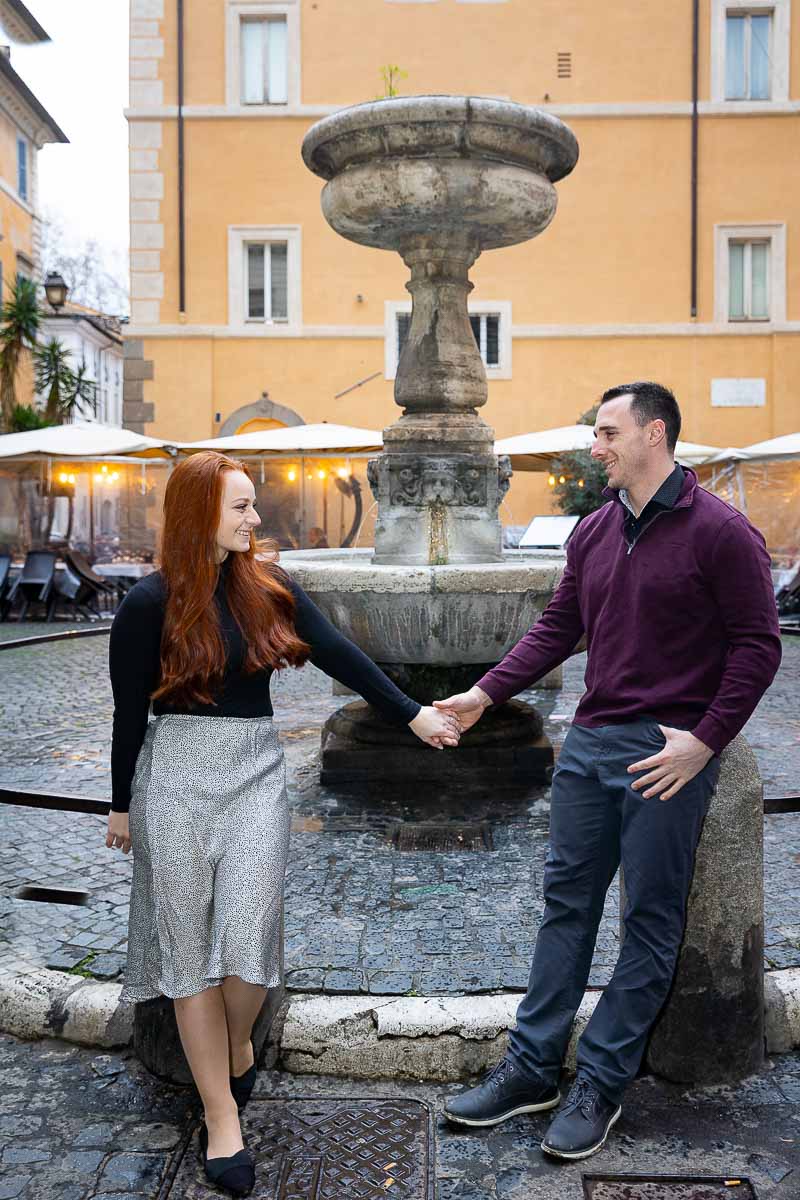 Couple kissing on a set of staircase found in the cobble stone streets of Rome Couple holding hands in a roman Piazza in front of water fountain
