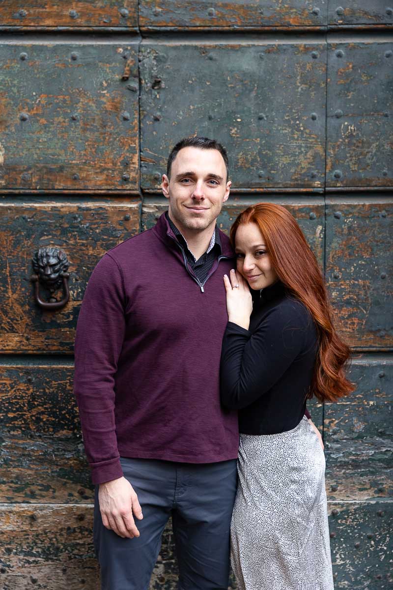 Engagement photography in front of an ancient green door