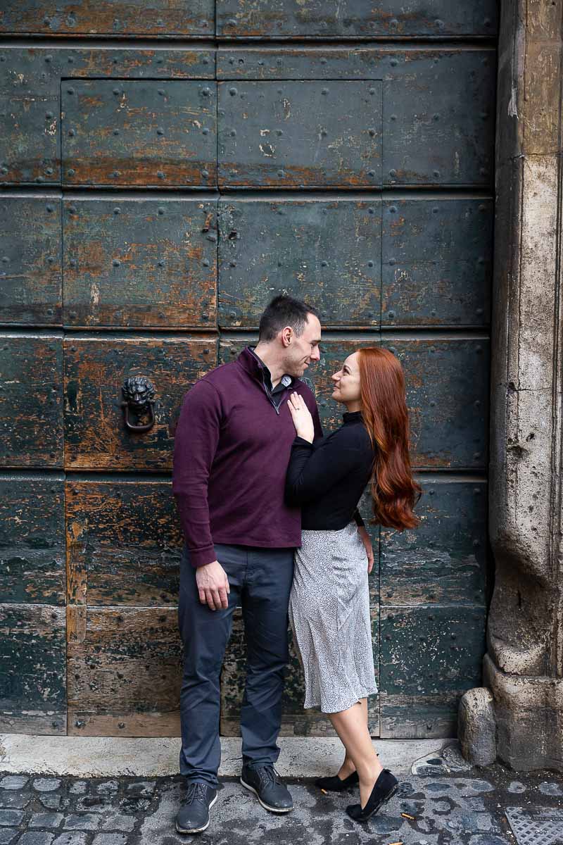 Couple portrait in the roman alleyways and streets Couple kissing during an engagement photo session in Rome Italy