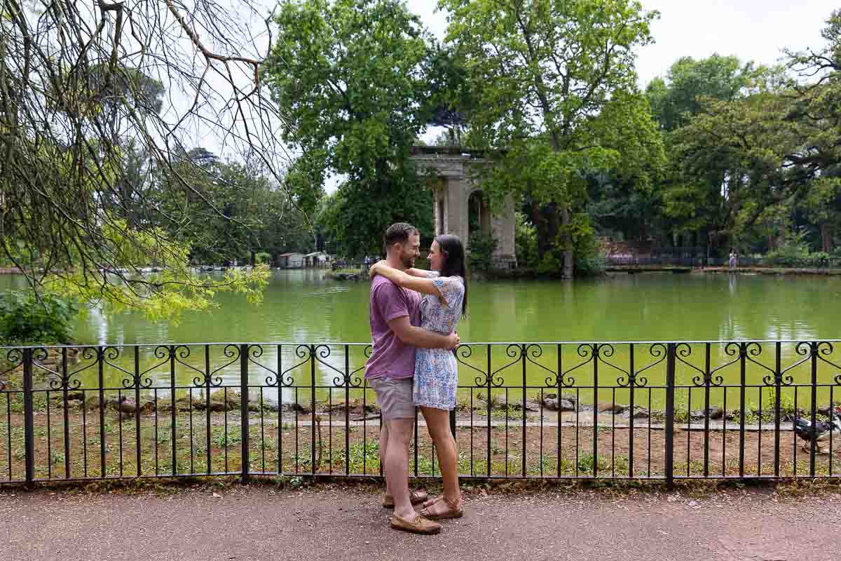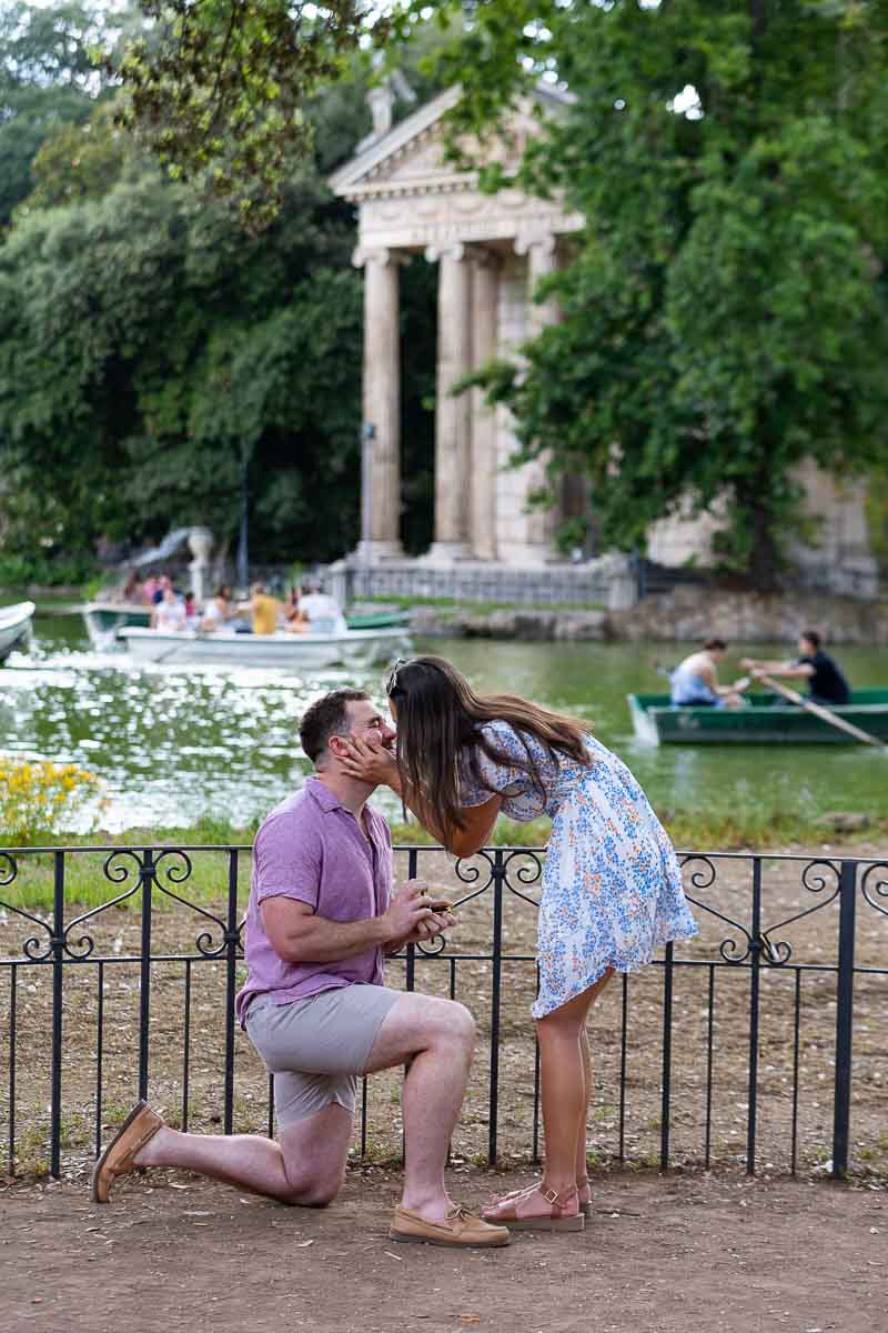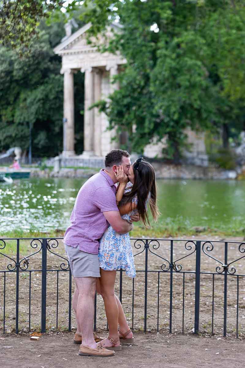 A beautiful and romantic surprise wedding proposal candidly photographed at the Villa Borghese lake in Rome Italy. Overlooking the Temple of Asclepius found across the lake. A temple dedicated to the god of healing. A surprise which was welcomed with overwhelming joy and happiness! And after catching breath, acquaintance was made with the photographer and videographer. Soon after to begin taking nice engagement photos trying out different poses.