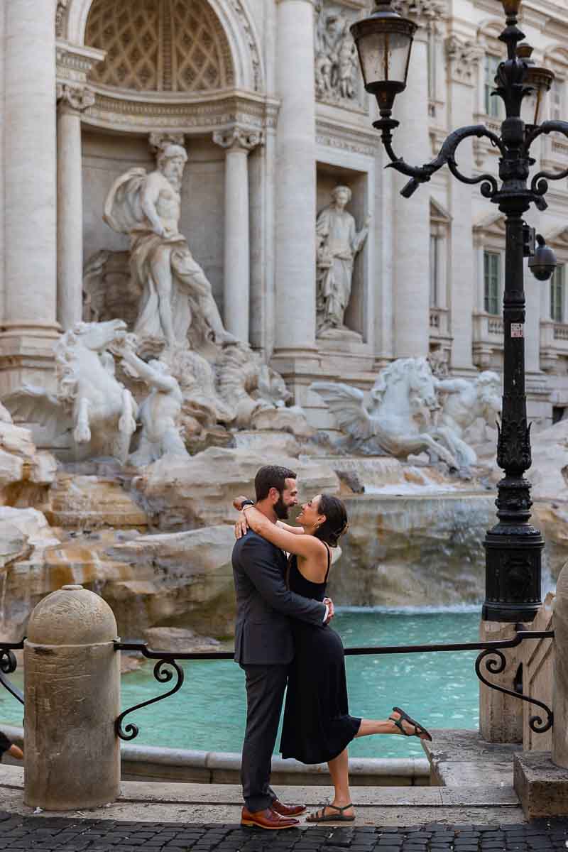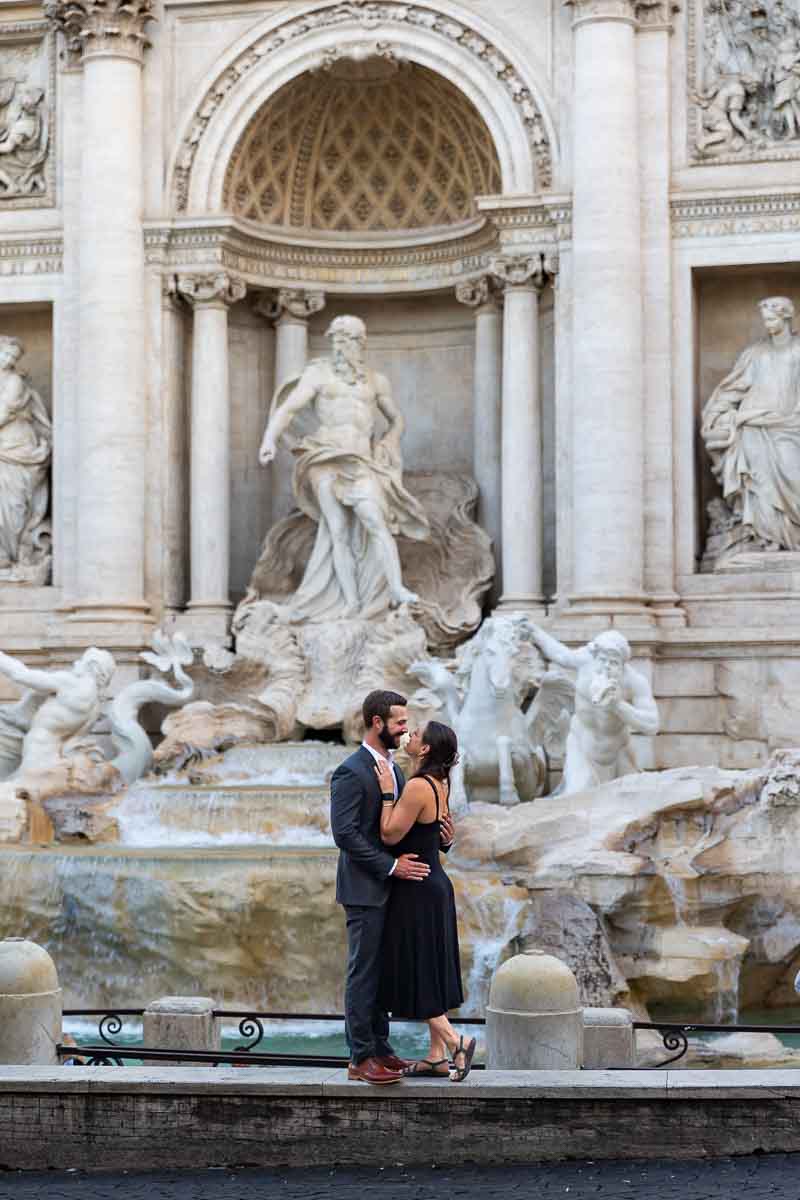 Standing sideways together by the Trevi fountain early morning light