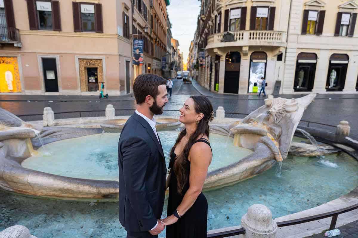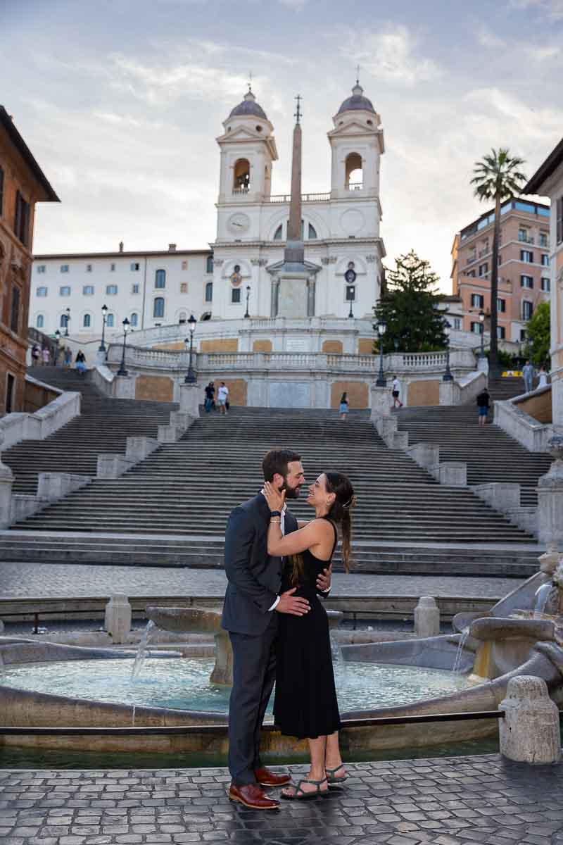 Couple portrait looking at each other bottom of Piazza di Spagna with pictures taken Barcaccia water fountain