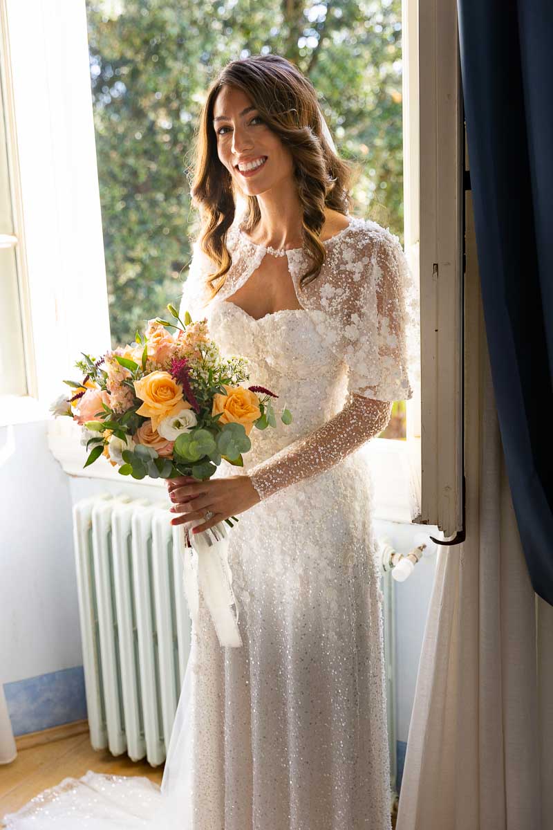 An enchanting destination wedding in Tuscany Italy taking place in a beautiful country house in the outskirts of Florence. Situated in a panoramic position on top of a hill that embraces a picturesque view over the countryside around Florence. The wedding day photography started with pictures of the bride & groom. With the photographer from Rome arriving a little earlier to get acquainted with the surroundings. To capture some initial villa shots and the amenities. As well as the beautiful flower details!
