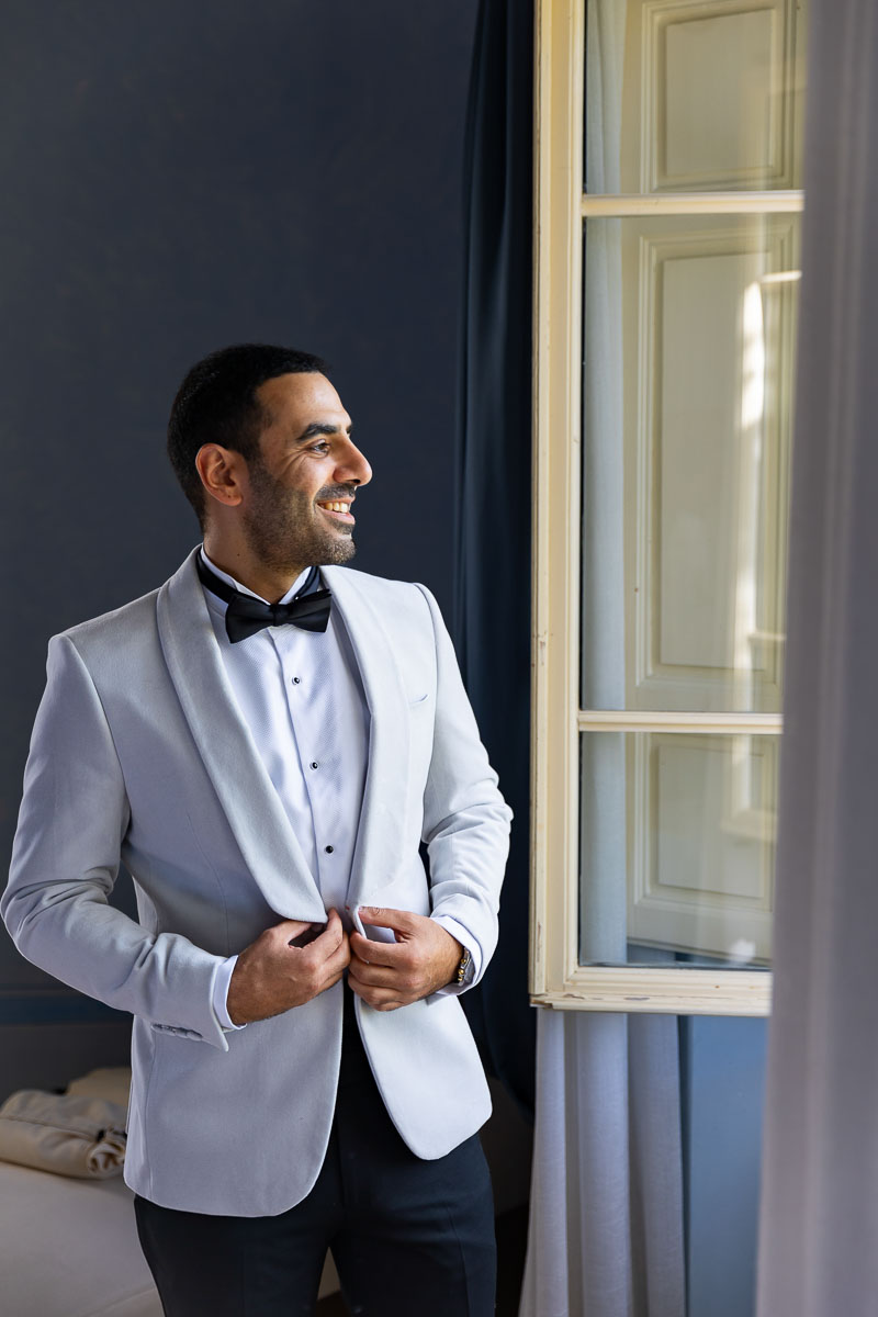 Meeting the handsome groom soon after to take some nice getting ready shots. Together with friends and family. Posing the portraits by the natural light found shining through the windows. Alternating both video and photography. And as the groom moved below to welcome the arriving guests. We moved over to the other room to meet the bride which looked stunning! Starting with some nice bridal photos by the window light as well as some sitting down shots.