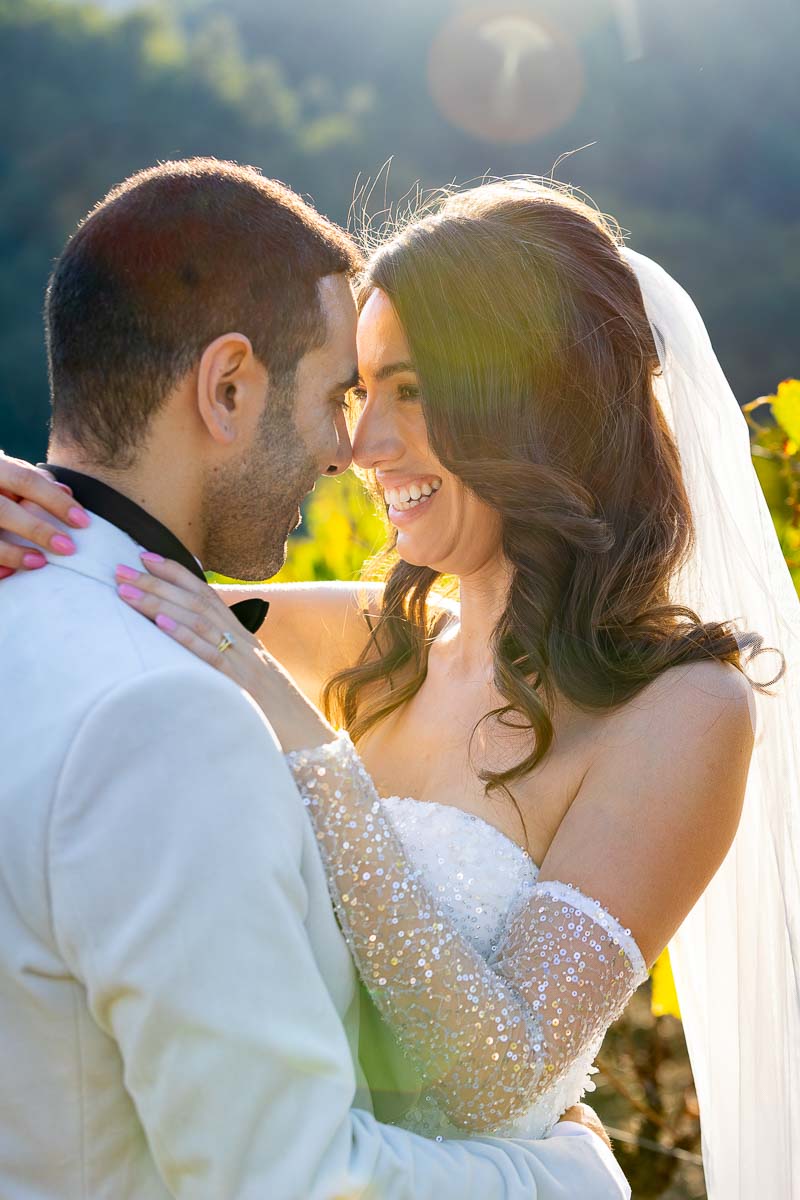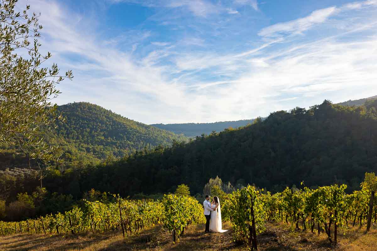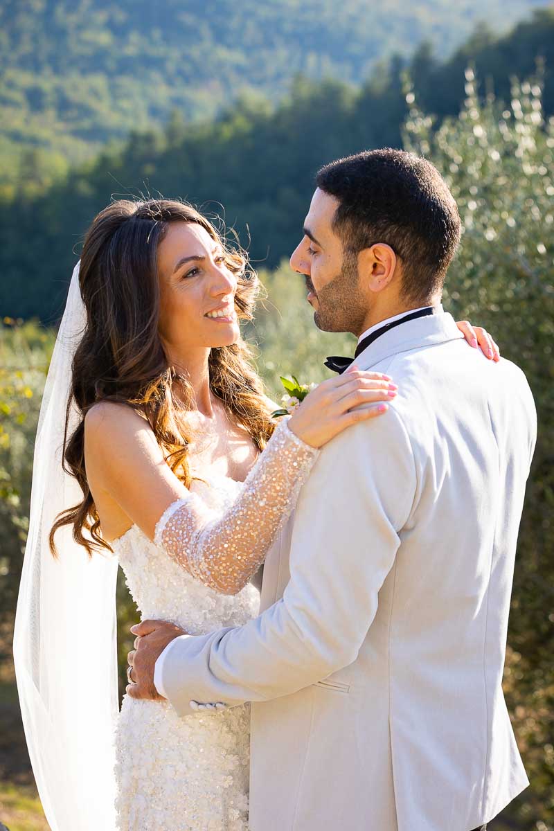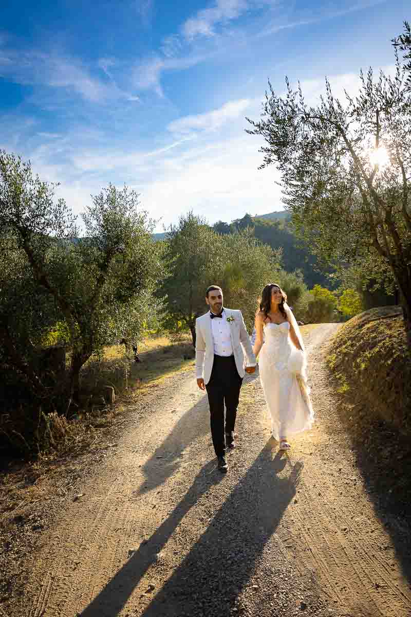 Afterwards, the wedding photography and videographer led the newly married couple into the olive tree field and vineyard for the couple photoshoot in Tuscany. Fund around the villa estate to take bride and groom shots. Where we found many different landscape views to take pictures in. Just as the golden light started to set in and the sun descending below the hills. Producing a beautiful smooth light which was perfect to get some nice just married photos! Concluding the photography session with some final drone video footage from above.